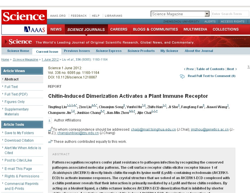 best365官网化学与分子工程学院常俊标教授与课题组宋传君博士及所指导的研究生樊芳芳通过与清华大学生命科学学院柴继杰博士等单位合作,完成题目为“Chitin-Induced Dimerization Activates a Plant Immune Receptor”的文章于2012年6月1日在国际重要期刊《Science》杂志上发表。此项研究在PRR蛋白质激活机制方面取得了重要突破。这是我省第一次以共同通讯作者身份在《Science》上发表论文,论文的发表标志着best365官网在该研究领域达到了国际领先水平。