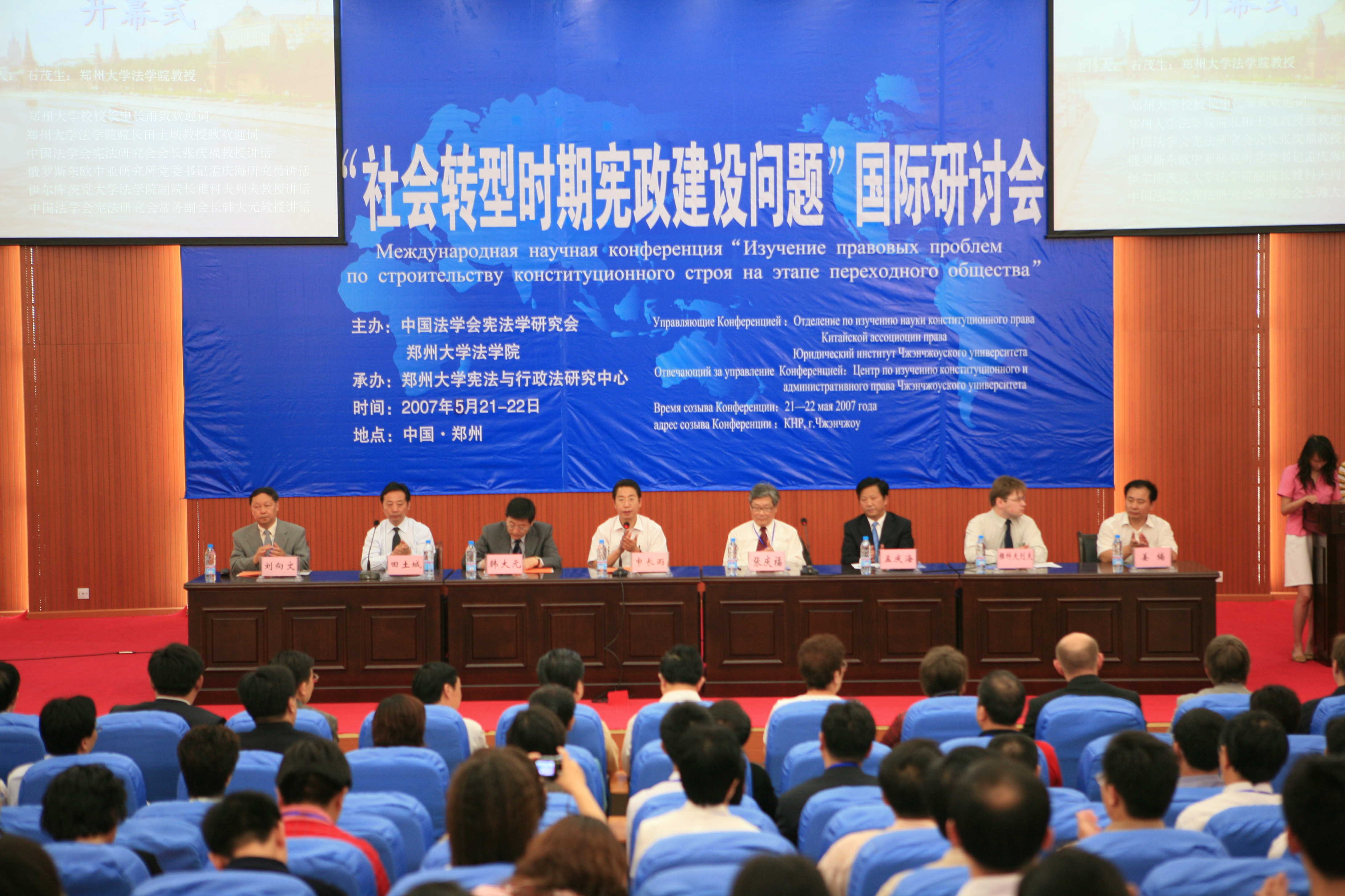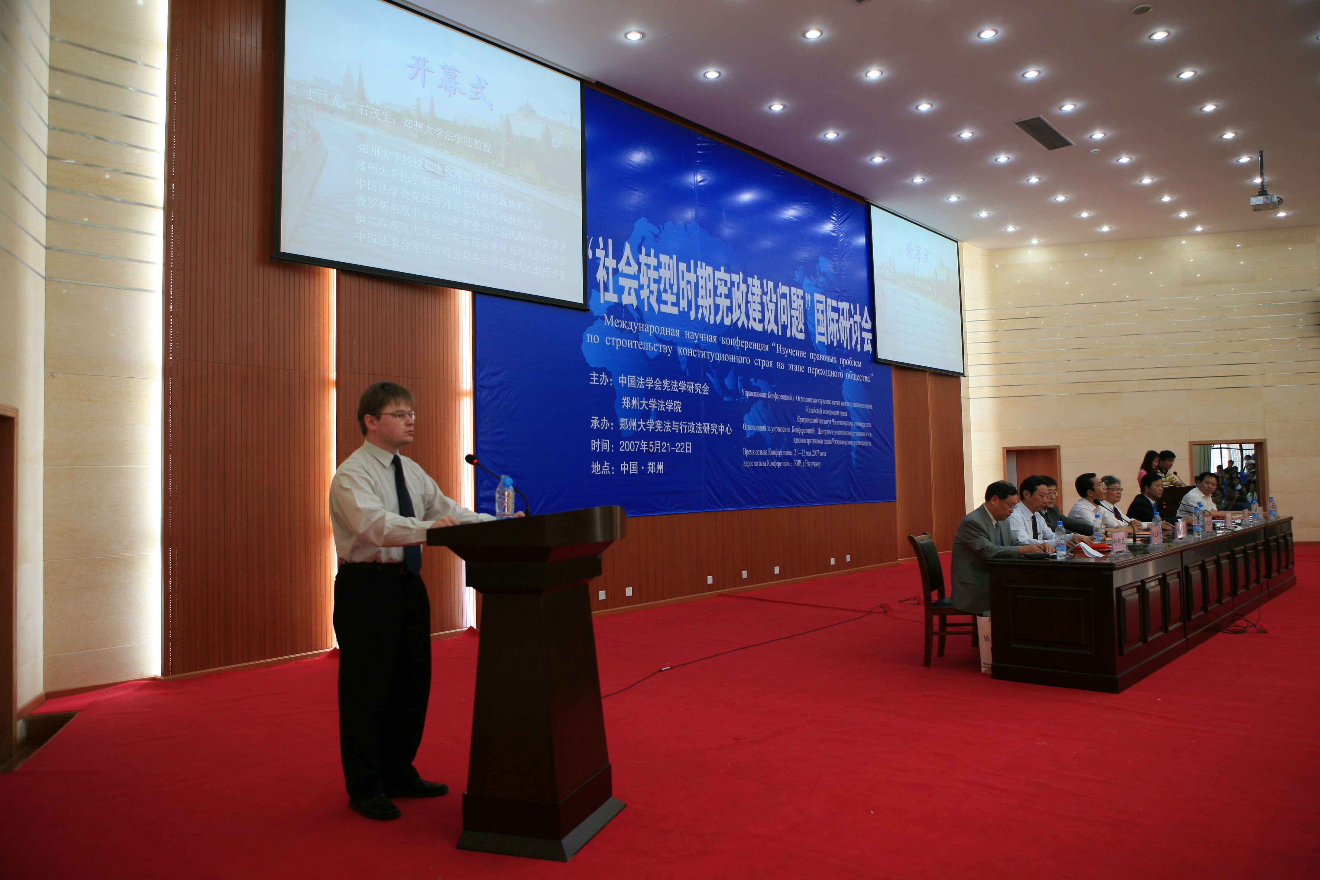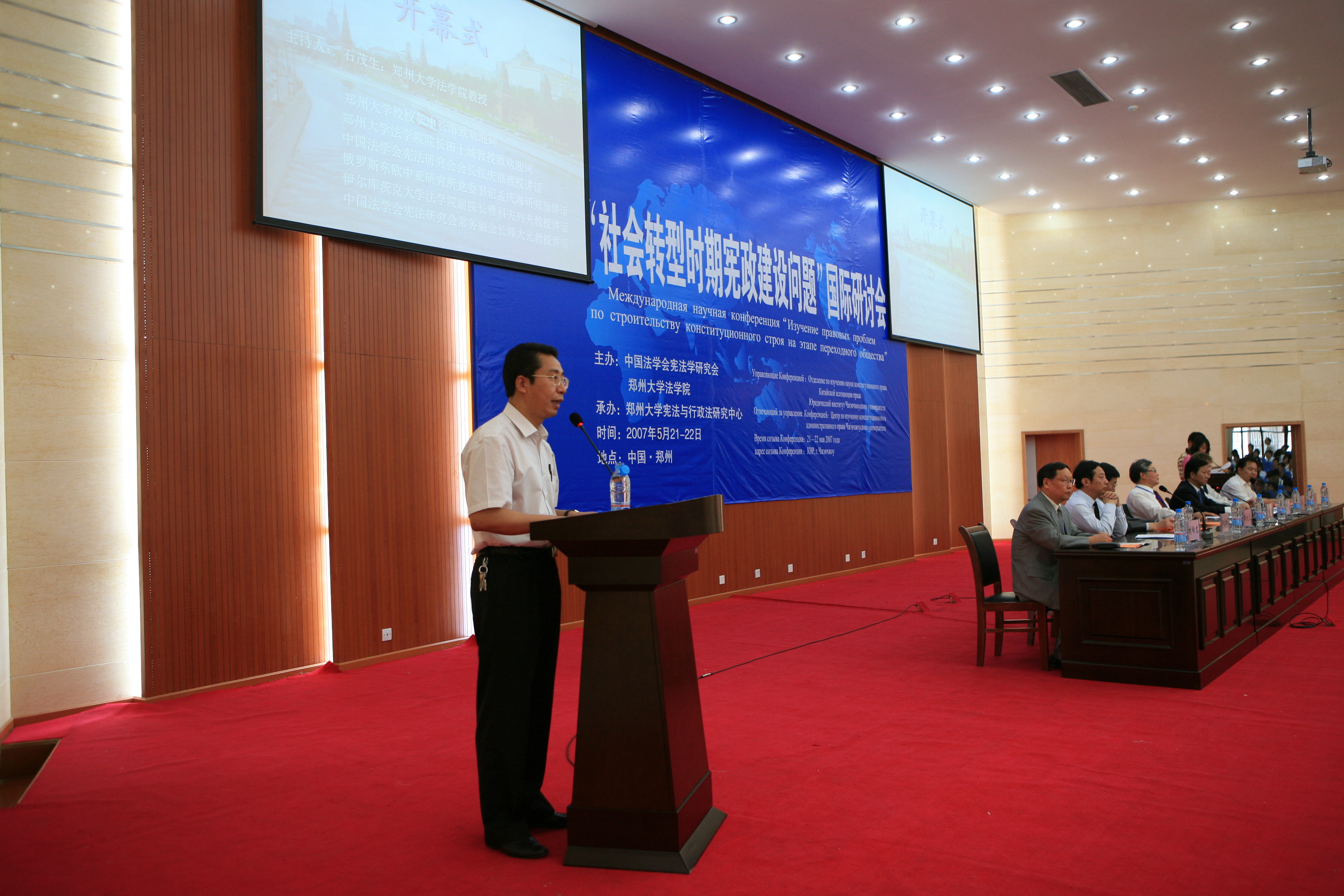 5月21日上午,社会转型时期宪政建设问题国际研讨会开幕式在best365官网法学院模拟法庭隆重举行。中国法学会宪法学研究会会长张庆福教授,中国社科院俄罗斯中亚研究所党委书记兼副所长孟庆海教授,伊尔库茨克国立大学法学院副院长雅科夫列夫•弗拉季斯拉夫•维克托罗维奇教授,中国法学会宪法学研究会常务副会长、中国人民大学法学院常务副院长韩大元教授,省教育厅社政处姜楠副处长,best365官网校长申长雨教授等在主席台就座。来自中国、俄罗斯的百余名专家、学者、司法界人士以及法学院师生共300余人参加了开幕式。