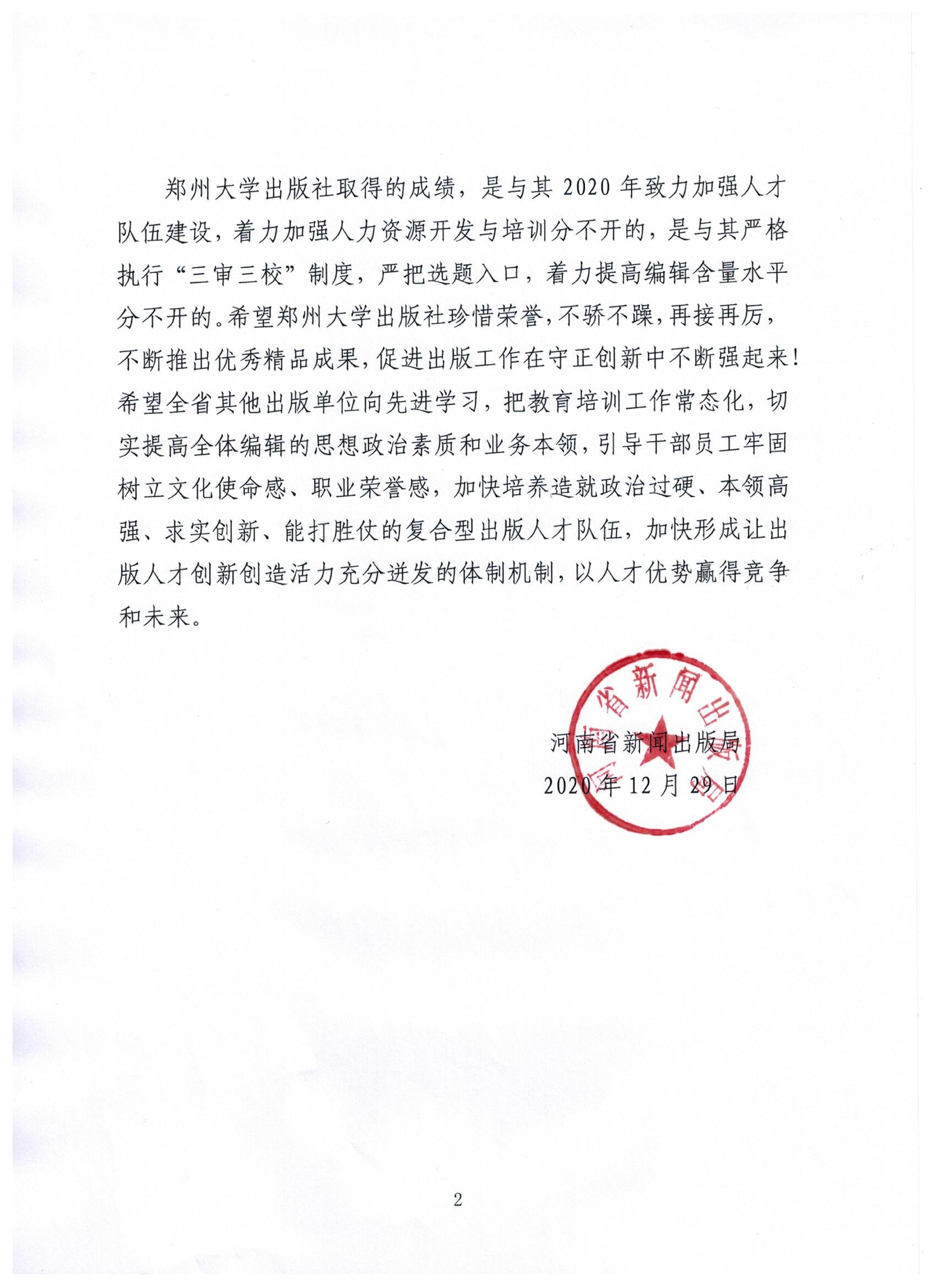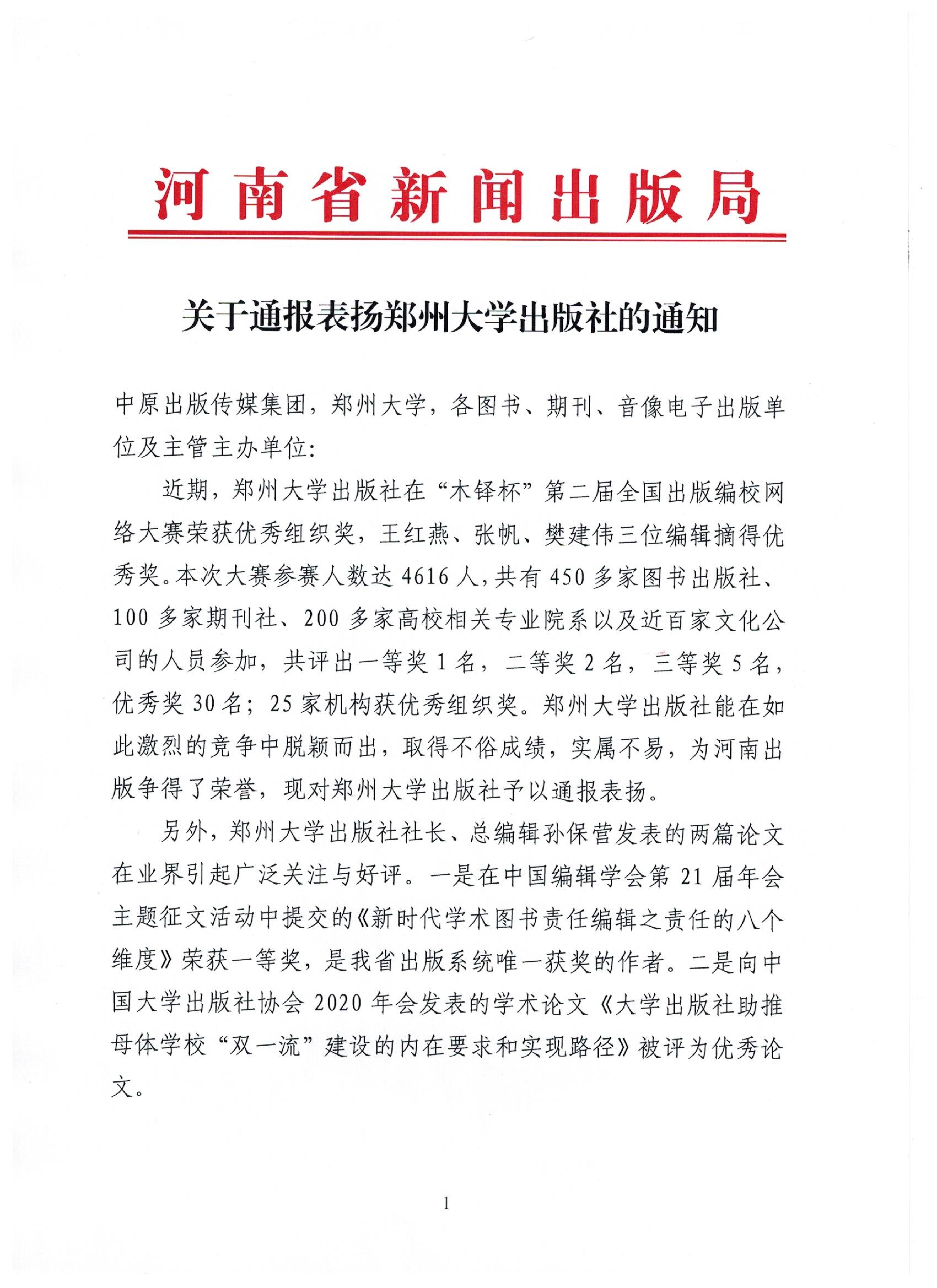 2020年12月29日,河南省新闻出版局向全省出版单位及主管主办单位下发《关于通报表扬best365英国在线体育官网出版社的通知》,对best365英国在线体育官网出版社近期在人才队伍建设方面取得的成绩给予专门通报表扬。