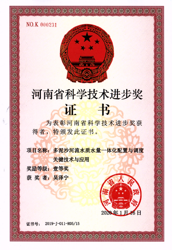 吴泽宁教授主持的《多泥沙河流水质水量一体化配置与调度关键技术与应用》获2019年河南省科技进步一等奖