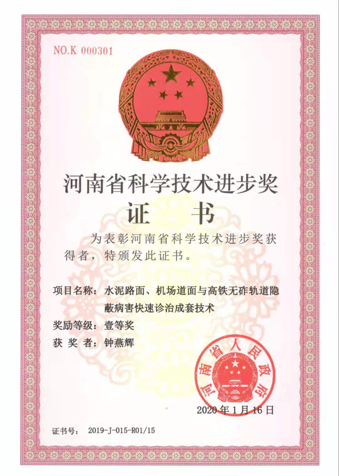 钟燕晖教授主持的《水泥路面、机场道面与高铁无砟轨道隐蔽病害快速诊治成套技术》获2019年河南省科技进步一等奖