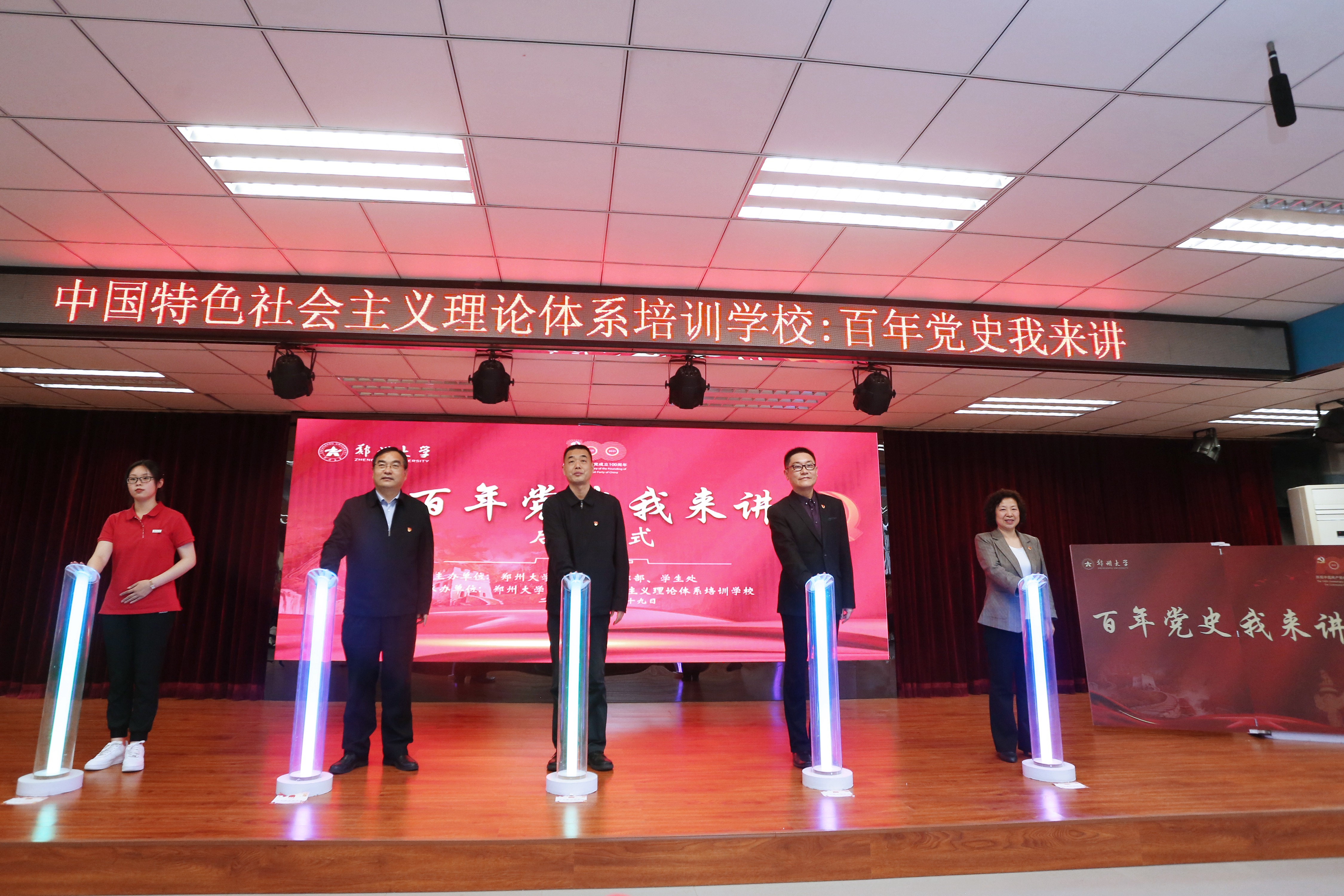 与会领导与学生宣讲员代表共同按下启动键,伴随着光柱缓缓亮起,“百年党史我来讲”系列活动正式启动。