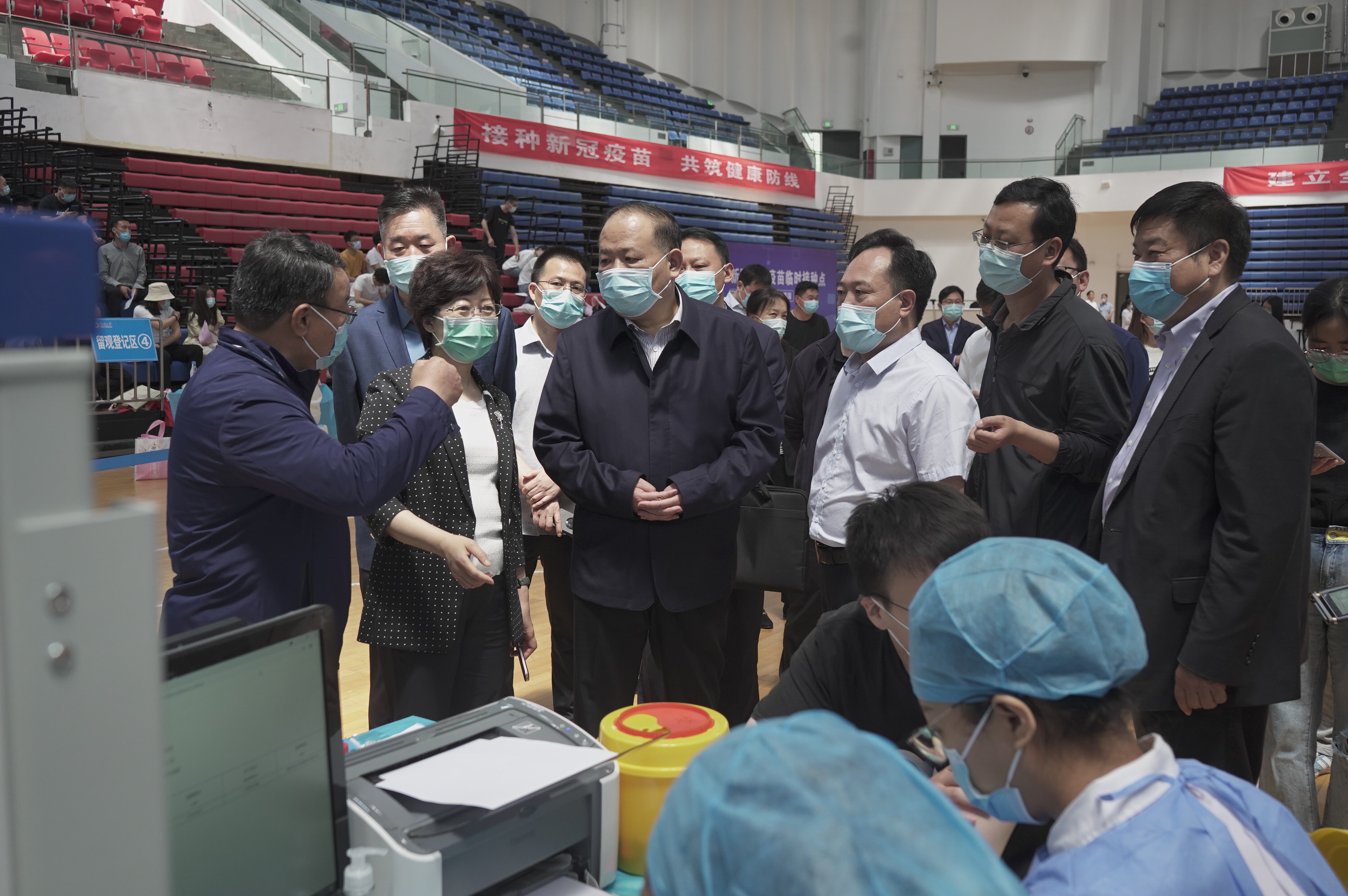 马林青一行来到主校区疫苗接种点中心体育馆,实地查看了冷链区、预检区、登记区、接种区、留观区和应急处置区等场所,向工作人员及接种疫苗学生询问接种新冠疫苗的具体情况,并听取了校医院负责同志关于接种流程、应急措施、后勤保障等相关工作的汇报。
