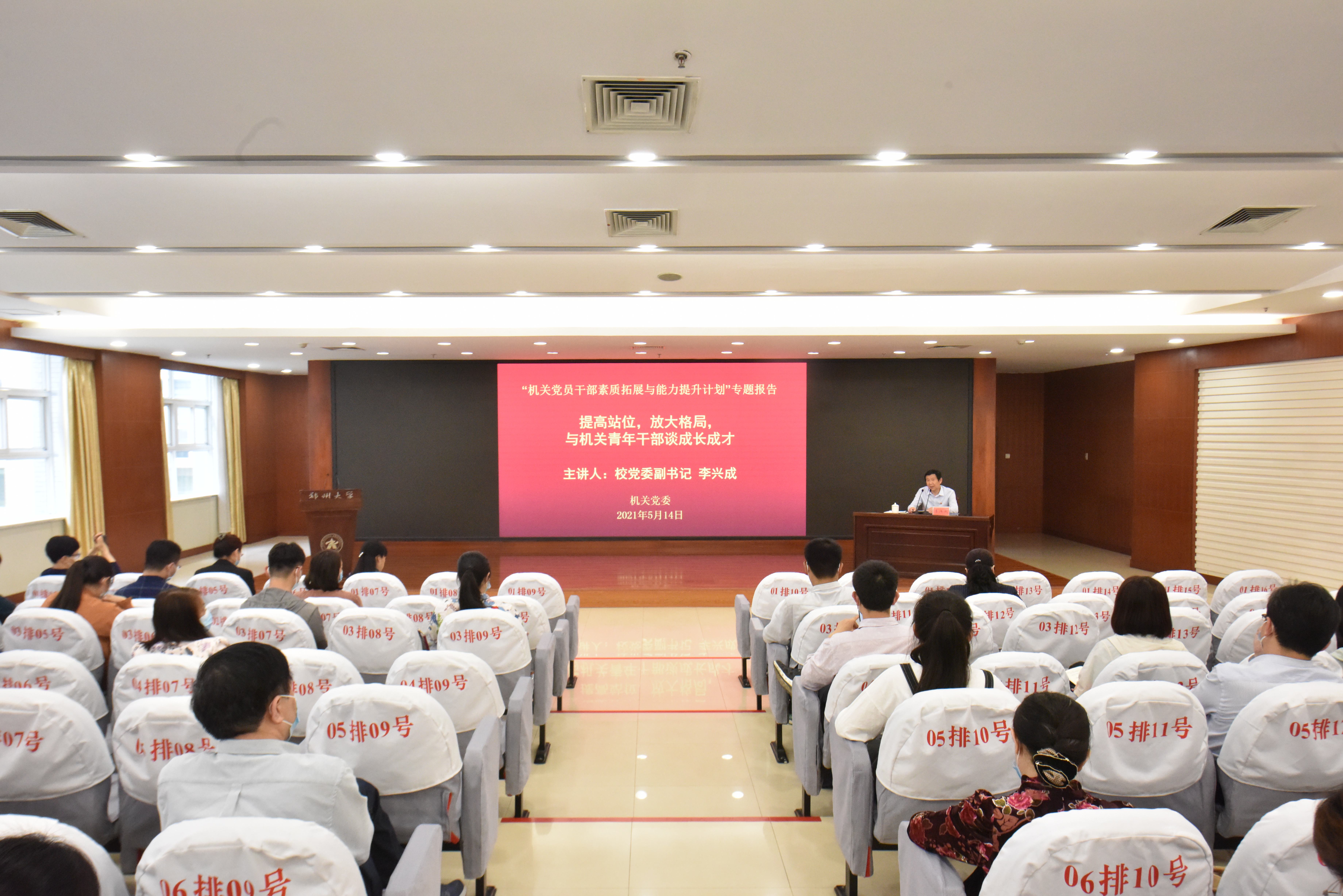 李兴成作题为《提高站位,放大格局,与机关青年干部谈成长成才》的专题报告。他指出,校部机关是学校党委和行政的参谋部和指挥部,是对外的窗口,是学校与基层院系之间承上启下的纽带。随后,他从什么是站位和格局、如何提高站位和放大格局、如何做人做事做干部三个方面,对机关干部提出了具体要求。他希望广大机关干部,尤其是青年干部,要提高站位、对党忠诚、胸怀大局、为民服务,不断提高政治判断力、政治领悟力、政治执行力,坚守理想信念和初心使命,自觉增强使命感和责任感,树立起工作高质量的“丰碑”和群众多称赞的“口碑”,为学校一流大学建设贡献力量!