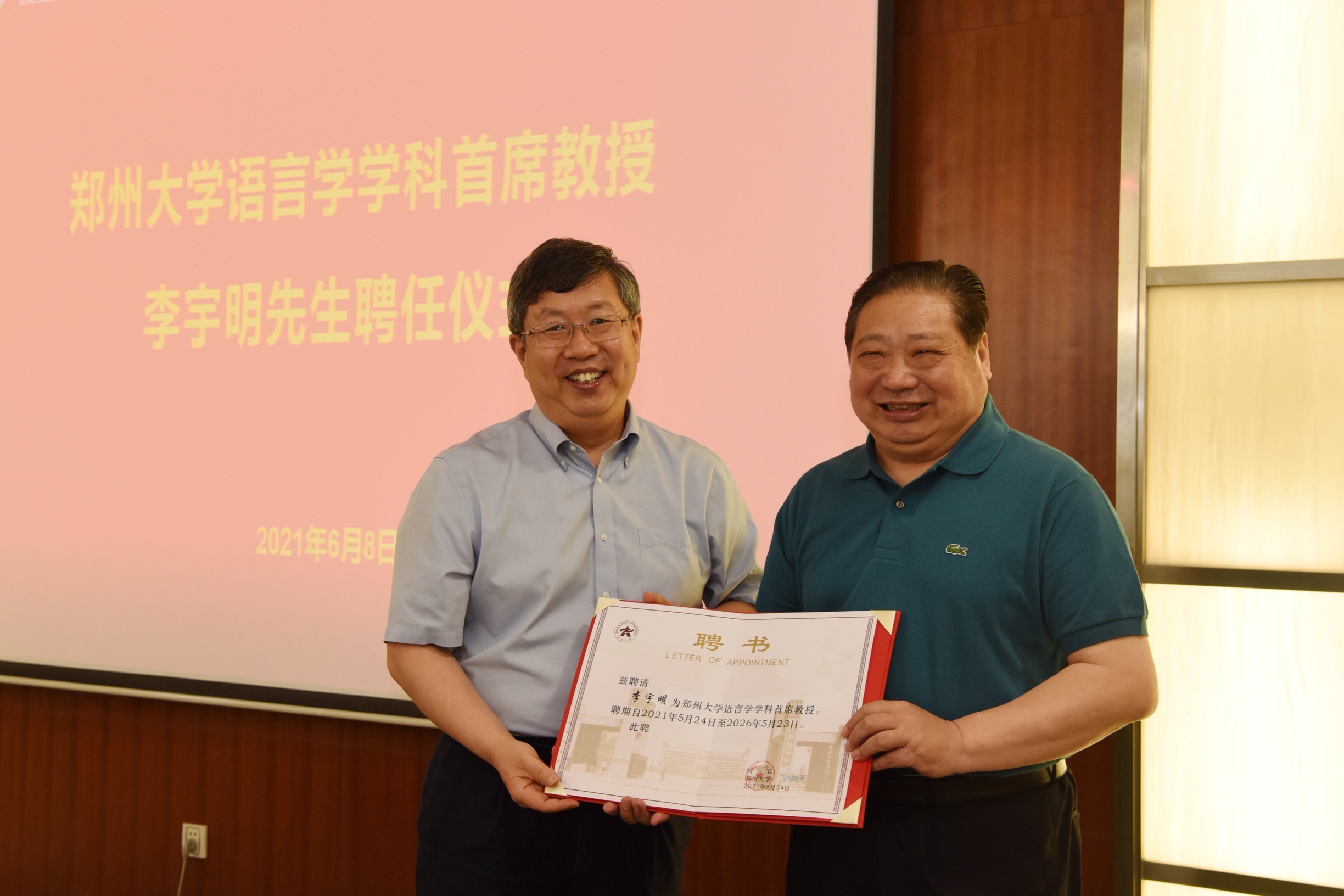 韩国河介绍了李宇明教授基本情况。刘炯天为李宇明教授颁发了聘书。