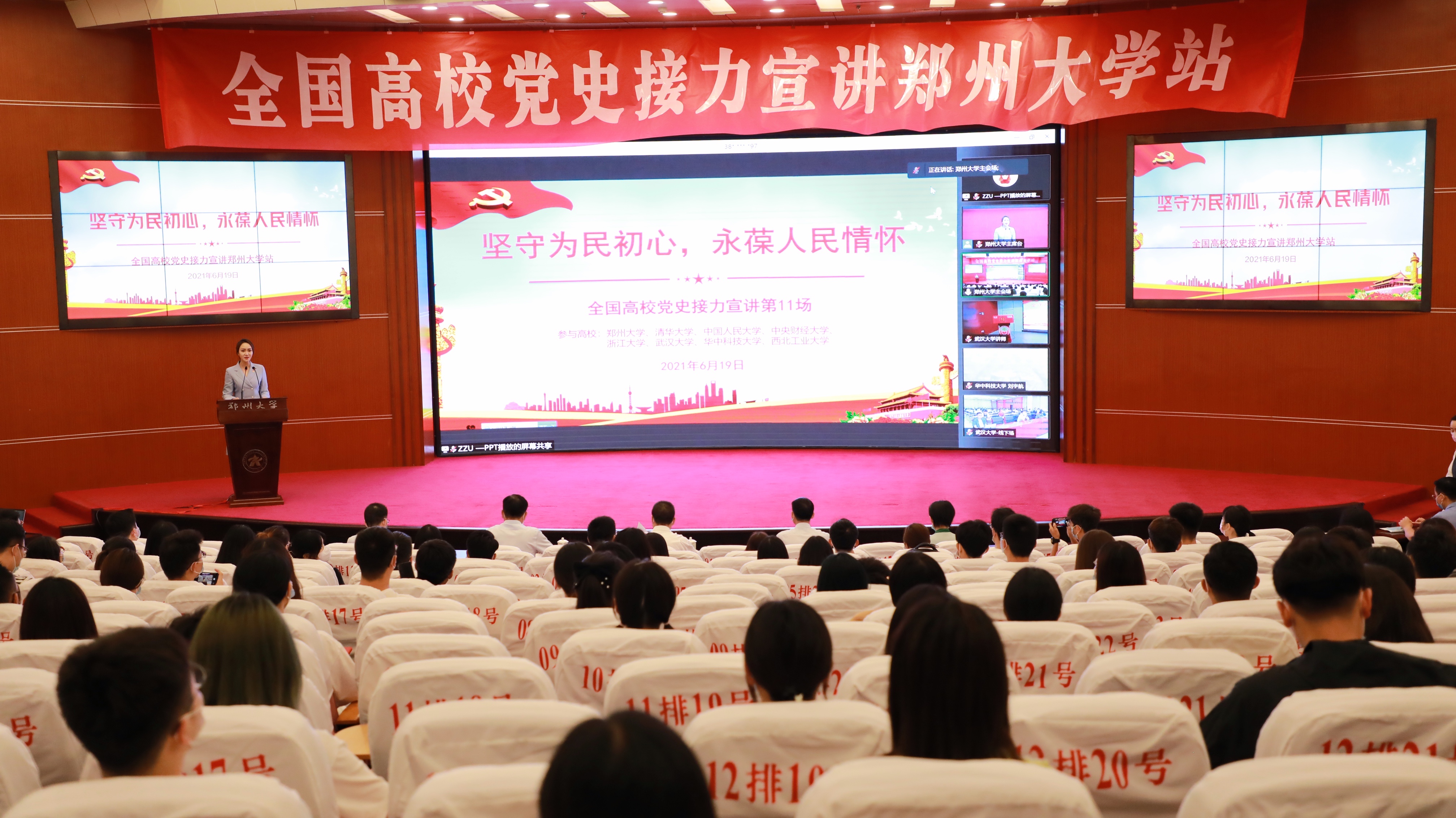 为深入学习贯彻习近平总书记在党史学习教育动员大会上的重要精神,激发广大学子爱党、爱国、爱人民的情怀,树立听党话、跟党走的坚定信念,6月19日下午,best365英国在线体育官网博士生宣讲团联合清华大学、中国人民大学、中央财经大学、浙江大学、武汉大学、华中科技大学、西北工业大学等高校宣讲团体,开展以“坚守为民初心,永葆人民情怀”为主题的“全国高校党史接力宣讲best365英国在线体育官网站”联合宣讲活动。校副书记吴宏阳出席,党委宣传部、党委研究生工作部负责同志,全校研究生党支部书记、博士生宣讲团成员在现场参加宣讲活动。学校全体研究生、全国高校党史宣讲联盟高校研究生在线上参加宣讲活动。