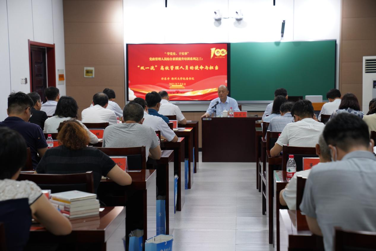 许东升传达了习近平总书记在“七一勋章”颁授仪式上和庆祝中国共产党成立100周年大会上的重要讲话精神和省委书记楼阳生来校调研时的讲话精神。他指出,习近平总书记“七一”重要讲话,回望光辉历史、展望美好未来,总结伟大成就、提出重要要求,作出庄严宣告、发出伟大号召,系统阐述了以史为鉴、开创未来的“九个必须”,是一篇马克思主义的纲领性文献,为全党全国各族人民向第二个百年奋斗目标迈进指明了前进方向、提供了根本遵循。一定要把学习贯彻总书记“七一”重要讲话精神作为重大政治任务抓紧抓实抓好,弘扬“七一勋章”获得者身上展现的“坚定信念、践行宗旨、拼搏奉献、廉洁奉公”的高尚品格,全面开创各项事业的新征程。