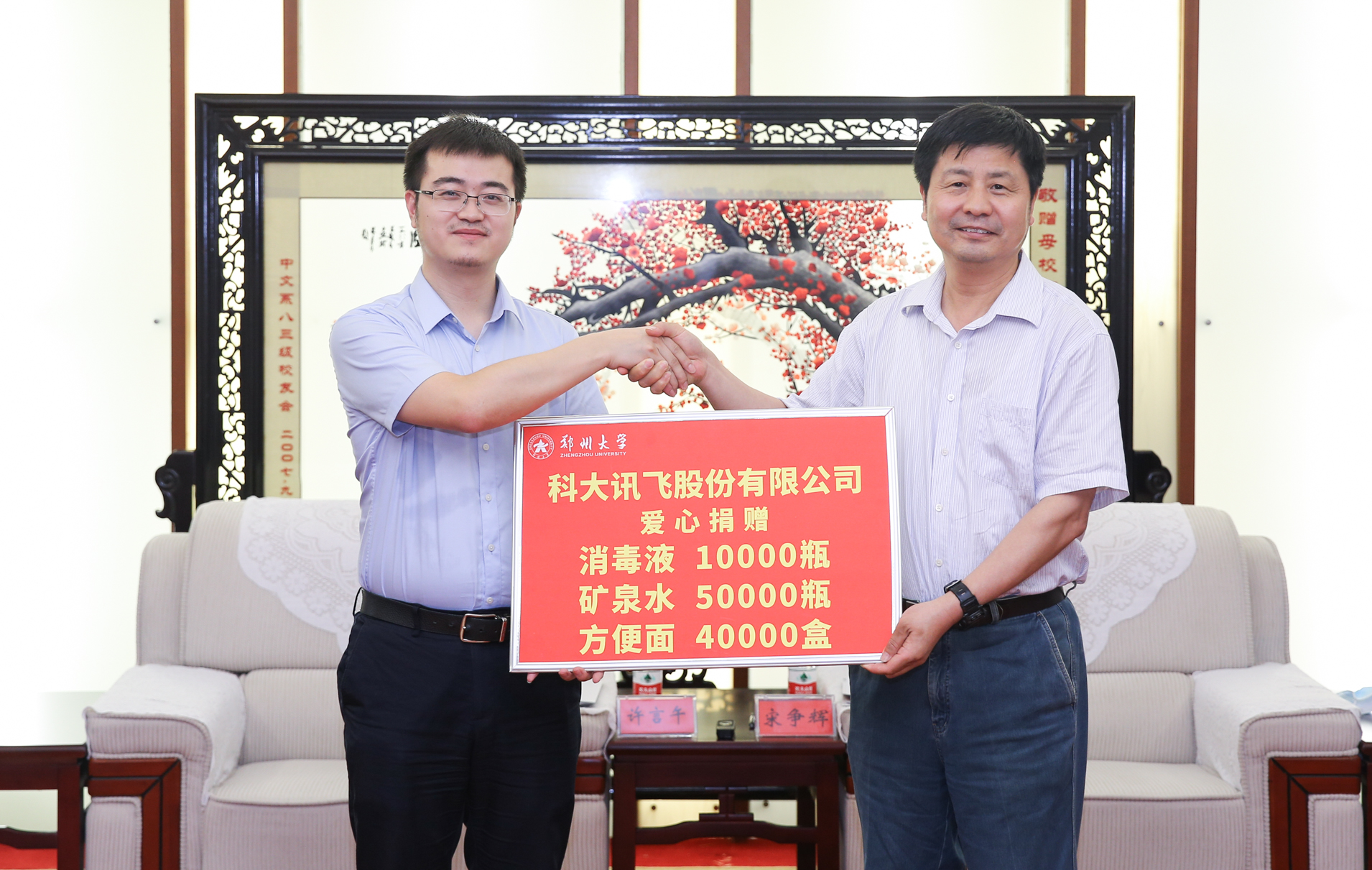7月22日上午,科大讯飞股份有限公司河南大区副总经理许言午、河南大区政企客户群总监杨少明等来校,捐赠防汛物资。校党委书记宋争辉,党委副书记、副校长王宗敏,副校长董子钢会见了许言午一行。党委办公室、党委研究生工作部、对外联络办公室等单位负责同志参加捐赠仪式。