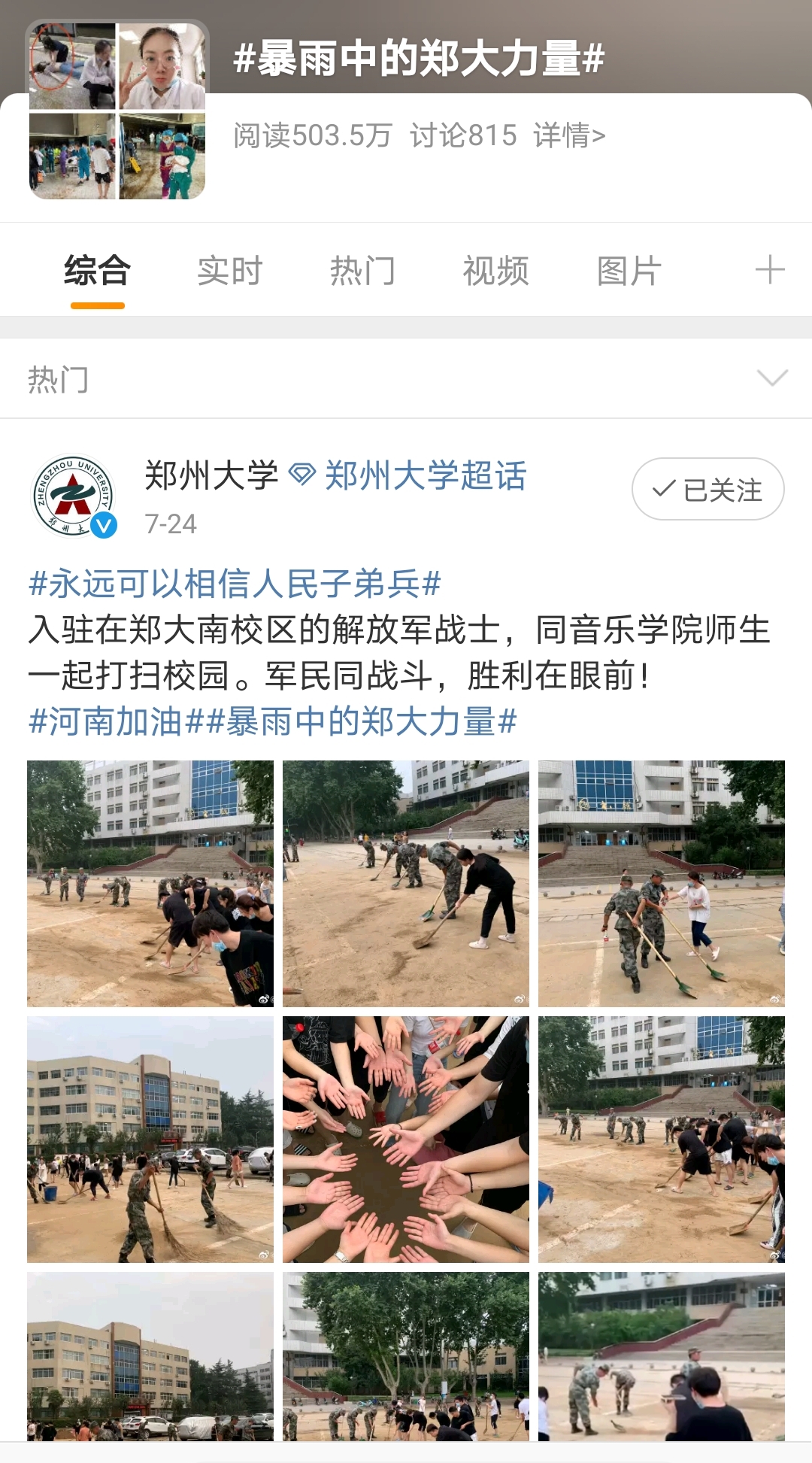 微博话题#暴雨中的郑大力量#