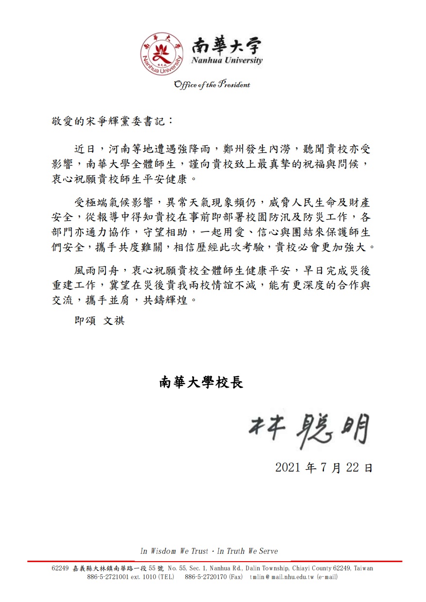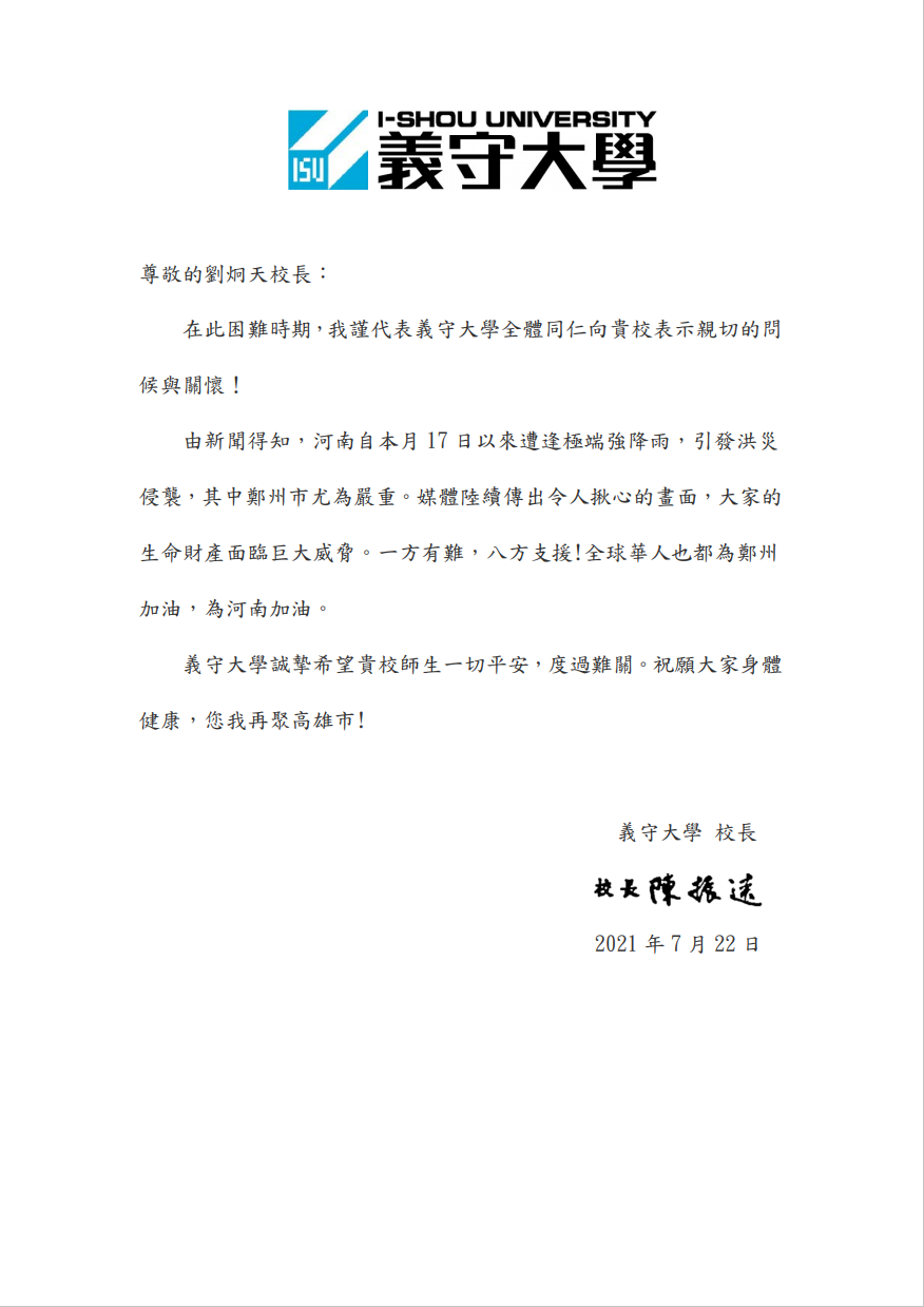 台湾义守大学陈振远校长在慰问信中表示:“一方有难,八方支援!全球华人都为郑州加油,为河南加油。义守大学诚挚希望best365英国在线体育官网师生一切平安,度过难关”。
