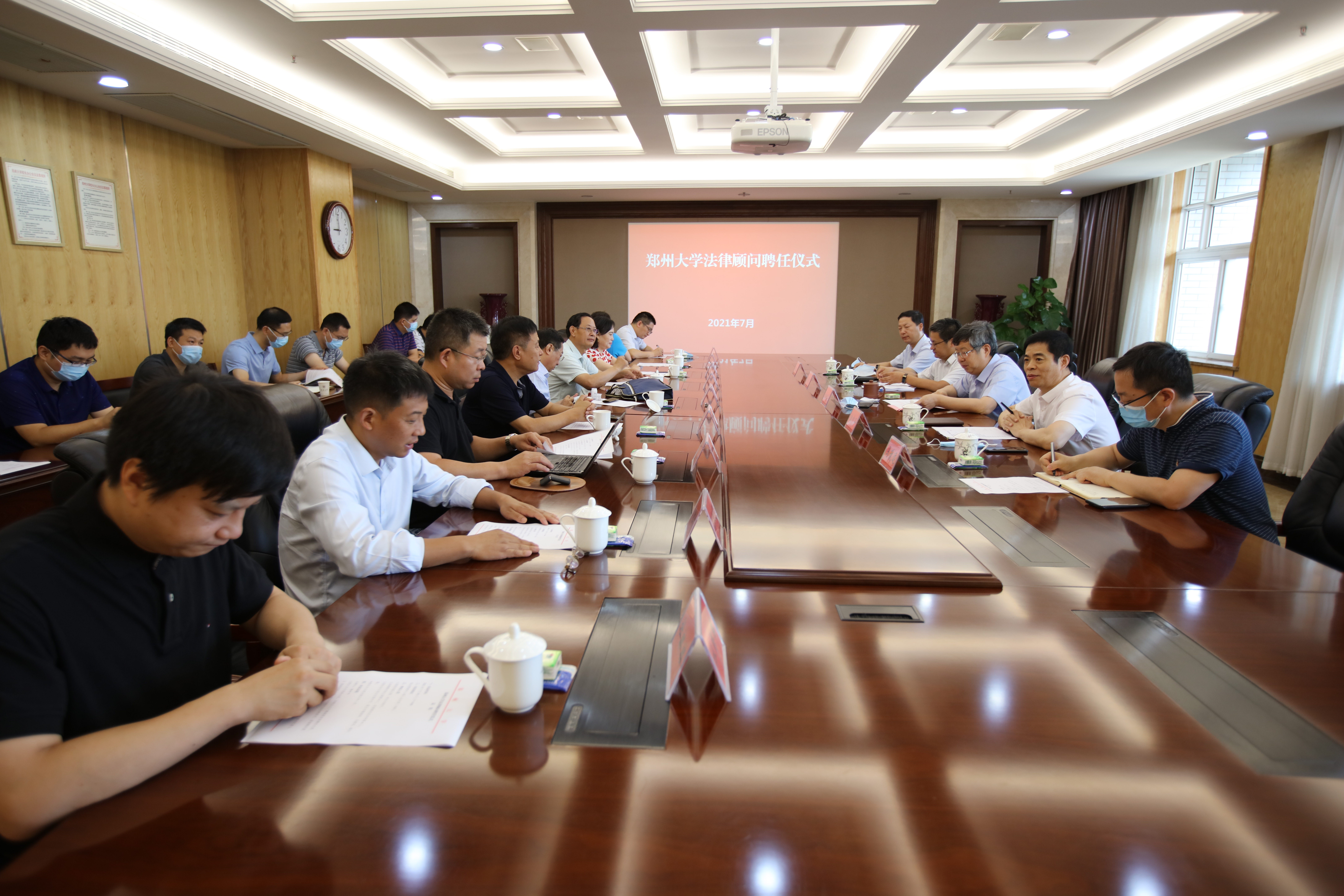 聘任仪式上,刘炯天为各位荣誉法律顾问、法律顾问颁发聘书。他对荣誉法律顾问多年来的辛苦付出表示感谢,并对新一届顾问团队的组建表示祝贺。他表示,上一届法律顾问团队秉持“求是 担当”的校训精神,在服务学校重大改革发展、制度体系建设、保障依法决策、维护校园安全稳定、防范与化解办学相关领域法律风险等方面发挥了重要作用。推动学校在制度建设、法律顾问机制构建、依法治校研究等方面取得了突出成效,在全国高校中有很强的代表性,形成了诸多“郑大经验”,走在全国高校前列。他指出,面向“十四五”,学校进入一流大学全面建设阶段,面临打造学科高峰、强化人才培养质量、推进开放办学、提升治理能力等诸多新的挑战,也对学校法治工作提出了更高的要求。他强调,新一届法律顾问团队要紧紧围绕学校一流大学建设主线,扛牢责任、服务大局,传承顾问团队的优秀传统,为学校把好关,守好法律底线;各位荣誉顾问要做好顾问团队的传帮带,继续支持学校工作;校长办公室(法制办公室)要进一步健全法律顾问工作机制,服务保障顾问团队开展各项工作。通过构建强有力的法治工作队伍,创新法治工作体制机制,深入推进依法治校各项工作,为学校一流大学建设提供坚强保障。