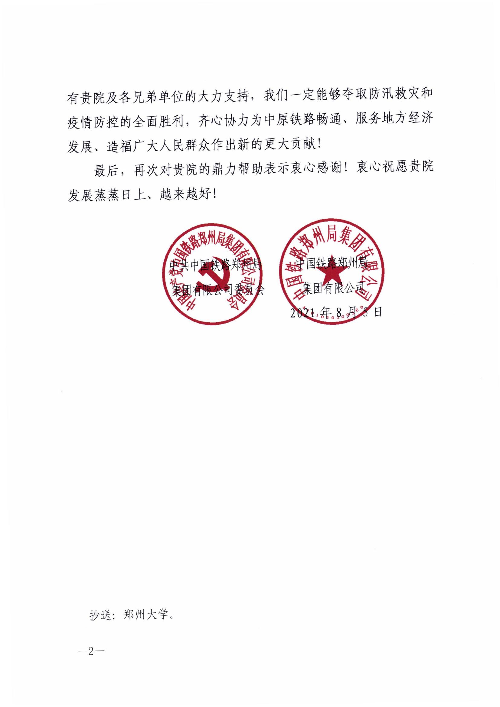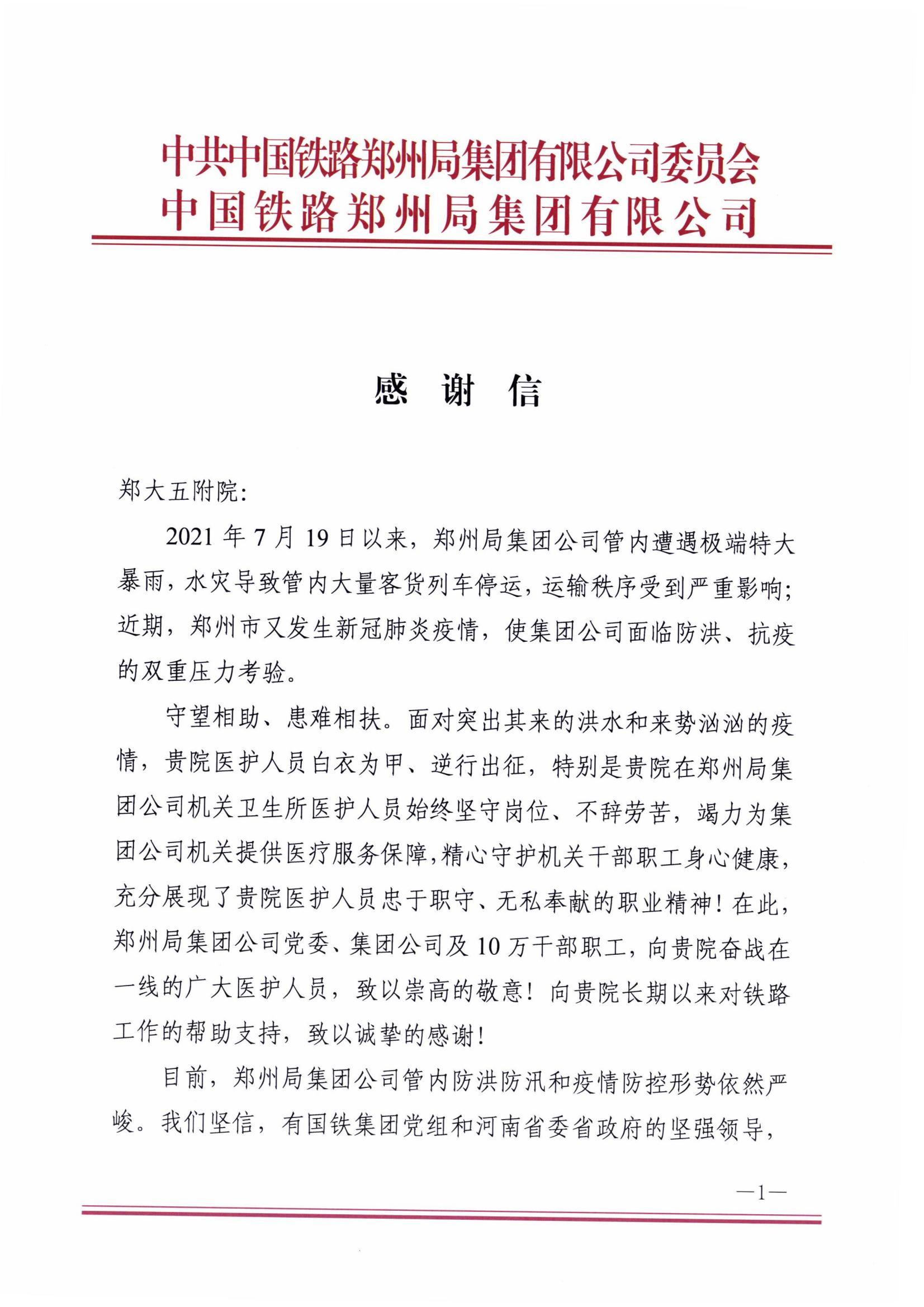 8月5日,中国铁路郑州局集团有限公司向best365英国在线体育官网五附院发来感谢信,对近期连续发生的极端特大暴雨和新冠肺炎疫情以来,医院直属郑州局集团公司机关卫生所医护人员坚守岗位、不辞辛苦,为该公司机关提供医疗服务保障,守护干部职工身体健康的事迹给予高度评价。