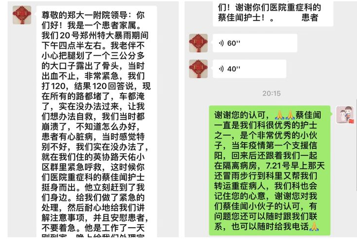 “尊敬的郑大一附院领导:你们好!我是一个患者家属。20日郑州特大暴雨期间的下午四点半左右,我老伴不小心把腿划了一个三公分多的大口子露出了骨头,当时出血不止,情况非常紧急!就在这时候,你们医院外科ICU的蔡佳闻护士挺身而出,立刻赶到了我们身边,给我们做了紧急的处理,然后耐心安慰我们并给我们讲解注意事项。”