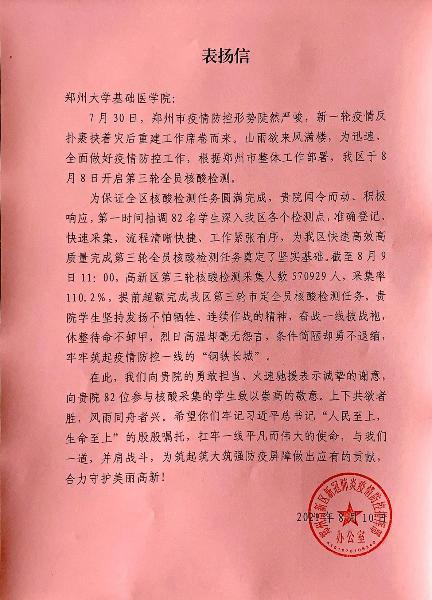 高新区疫情防控指挥部给基础医学院发来表扬信