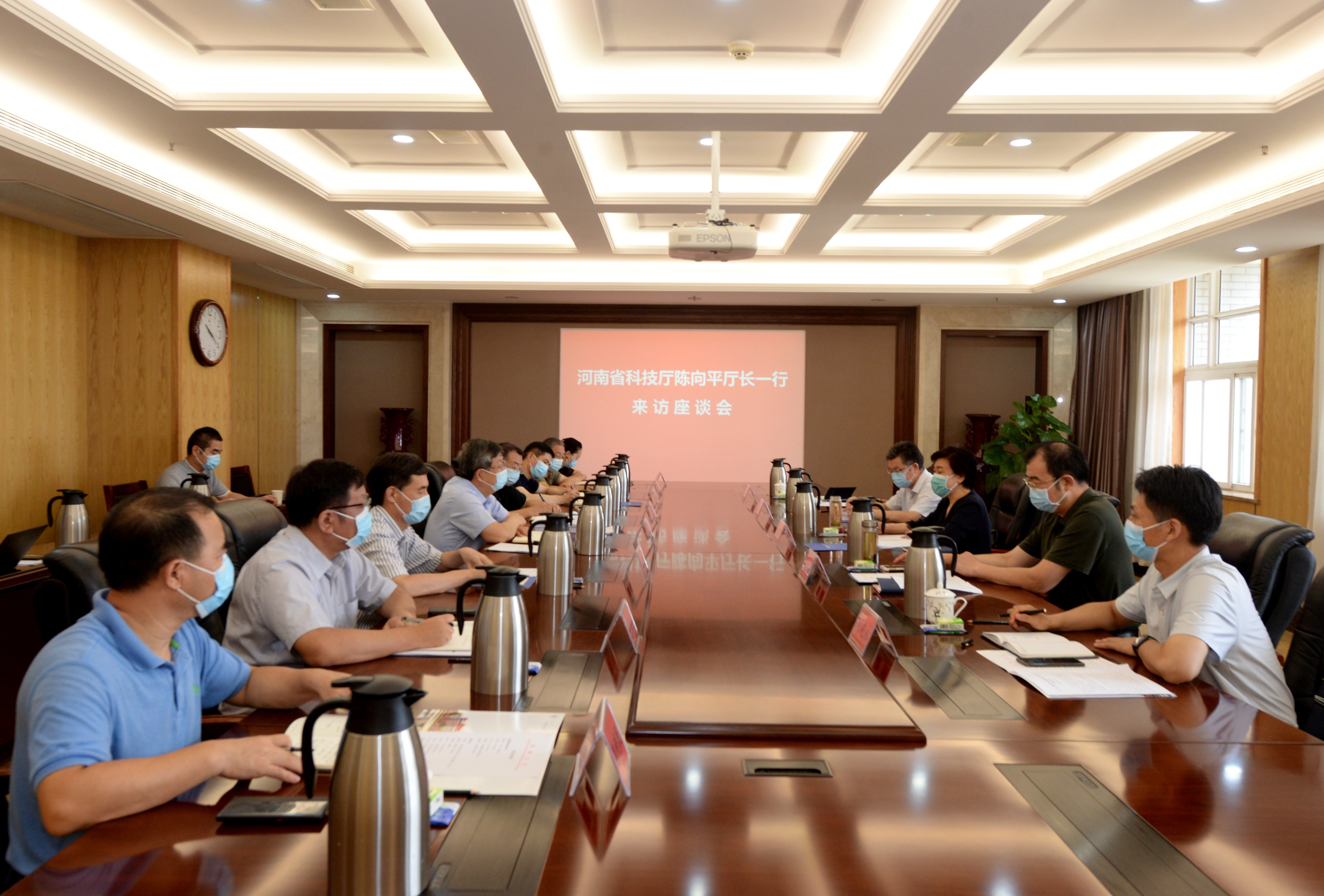 8月20日上午,河南省科技厅党组书记、厅长陈向平,总工程师何守法及办公室、资源配置与管理处、基础研究处负责同志来校调研。省政协副主席、校长刘炯天,副校长屈凌波、赵明皞出席座谈会。校长办公室、发展规划处、学科与重点建设处、科学技术处、大学科技园建设管理中心负责同志参加调研活动。