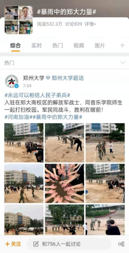 官方微博“暴雨中的郑大力量”话题