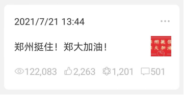官方微信热点推文“郑州挺住!郑大加油!”