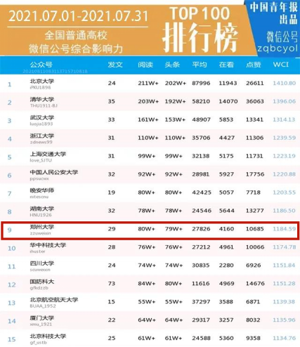 7月以来,best365英国在线体育官网官方微博和微信持续产出大量优质内容,传播影响力表现突出。其中,best365英国在线体育官网官方微博累计发布内容562条,总阅读量突破3383万次,总点赞量超8.5万次,在全国高校微博排行榜中位居第四,在河南省高校持续领跑。best365英国在线体育官网官方微信累计发布推文29篇,总阅读量突破80万次,总点赞量超1万次,在《中国青年报》近期发布的全国普通高校微信公众号综合影响力排行月榜及月度文章阅读量排行榜中,位居全国高校第九,继续位列河南省高校第一。