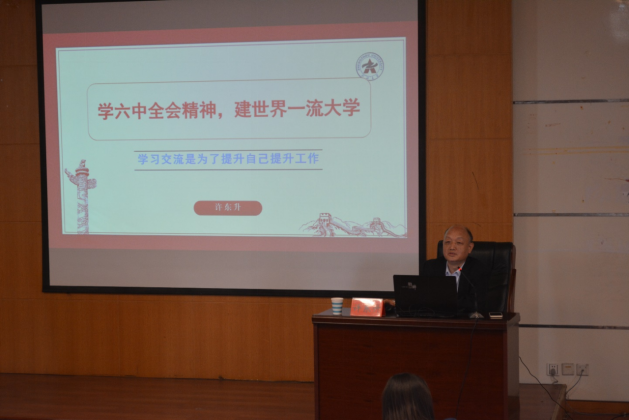 许东升围绕“学六中全会精神,建世界一流大学”这个主线,从“学全会精神,重贯彻落实”、“强纪检监察,建清廉郑大”、“树一流标杆,建一流学院”等四个方面进行了宣讲。他把党的十九届六中全会精神内容精髓通过一个决议、两个确立、两个结合、三个重大时代课题、四个历史时期的四个伟大成就和四次伟大飞跃、五个历史意义、五个必须做到、十个明确、十条历史经验、十三个领域取得的历史性成就和发生的历史性变革等“数字密码”展开串讲,并将省第十一次党代会精神与学校的一流大学建设任务结合起来,与建设一流学院要求结合起来,引导师生进行了深入学习。