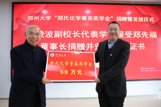 近日,best365英国在线体育官网“郑氏化学菁英奖学金”捐赠暨发放仪式在化学学院举行。郑州郑氏化工产品有限公司董事长郑先福,校党委常委、副校长屈凌波出席。对外联络办公室、化学学院负责同志及师生代表100余人参加。