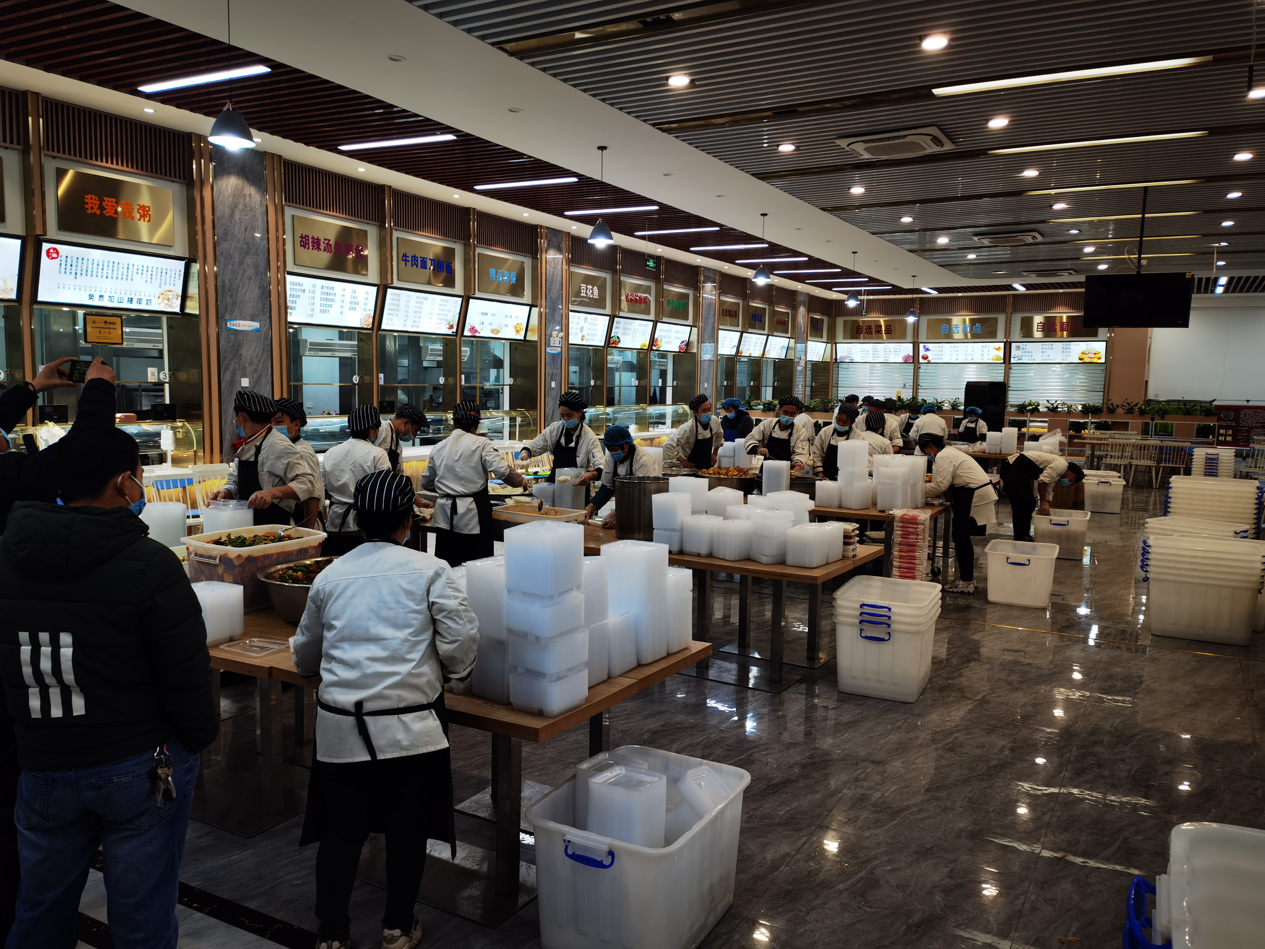 1月9日凌晨,接到校园临时管控的消息后,后勤集团负责同志立即到岗,启动应急预案。集团主要负责同志告诉大家:“保障留校学生吃上饭是目前后勤集团最重要的工作。”各食堂随即做好了停止堂食的准备,将面食类、小吃类等经营品种全部调整为套餐,随时准备为学生送餐。随着经营品种的变化,食品原材料需求也随之调整。后勤集团在食堂原有存货的基础上紧急进行采购。凌晨4点多,后勤集团联系供货商,紧急配送猪肉3000余斤、蔬菜6000余斤、大米9000斤、一次性套餐盒128000个等物资。校门封闭后,采购部主任王亚东等5人,将食材、物资从学校东门的货车上一斤斤、一件件地转运到后勤集团的两辆货车上。他们往返食堂5趟,在寒冬中忙的汗流浃背,为集中送餐做好了充分的物资准备。
