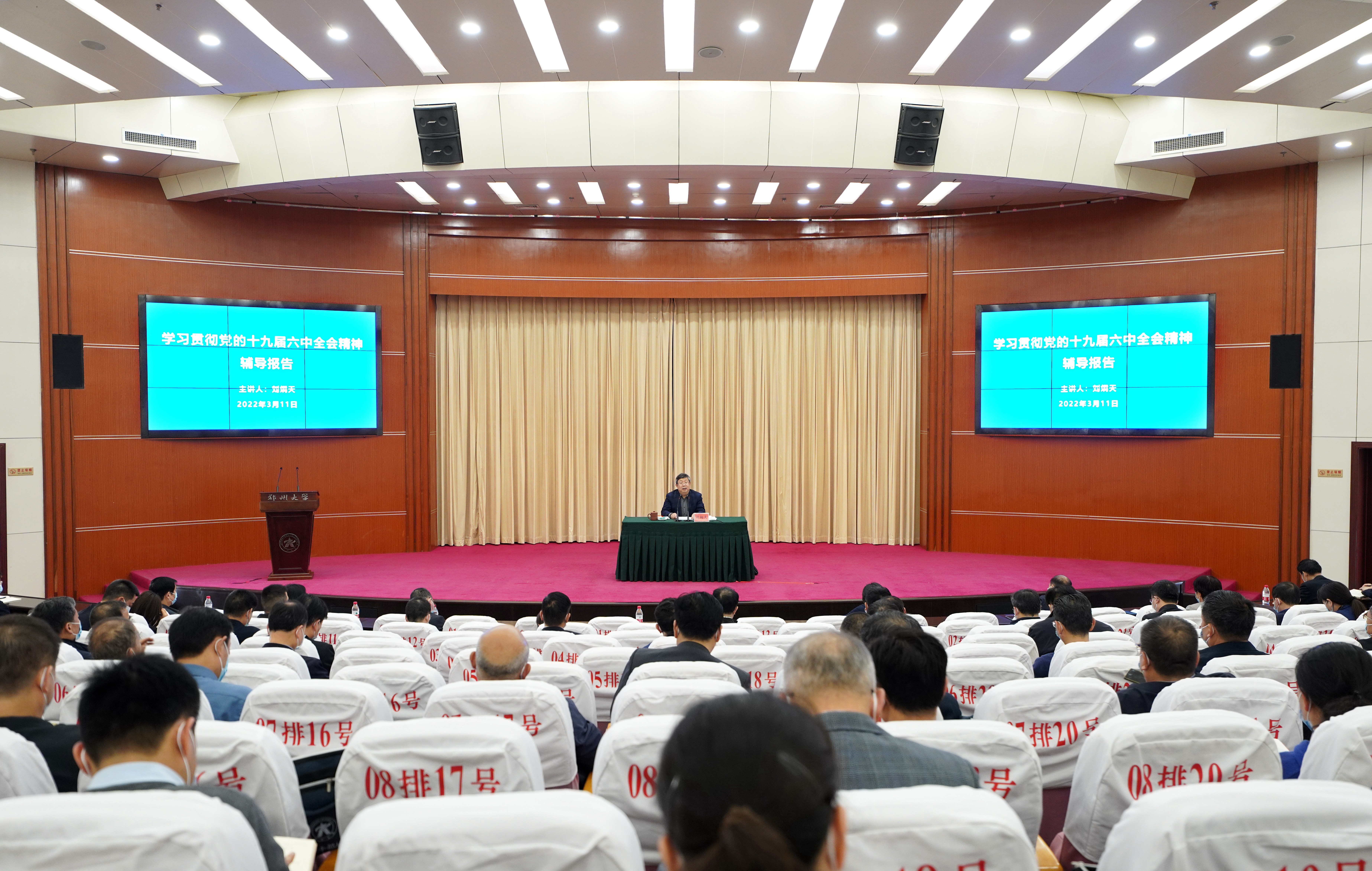 为全面深入学习宣传贯彻党的十九届六中全会精神,以过硬能力作风努力开创学校一流大学建设新局面,3月11日下午,河南省政协副主席,best365英国在线体育官网党委书记、校长刘炯天在主校区第一报告厅为全校处级干部作学习贯彻党的十九届六中全会精神辅导报告。