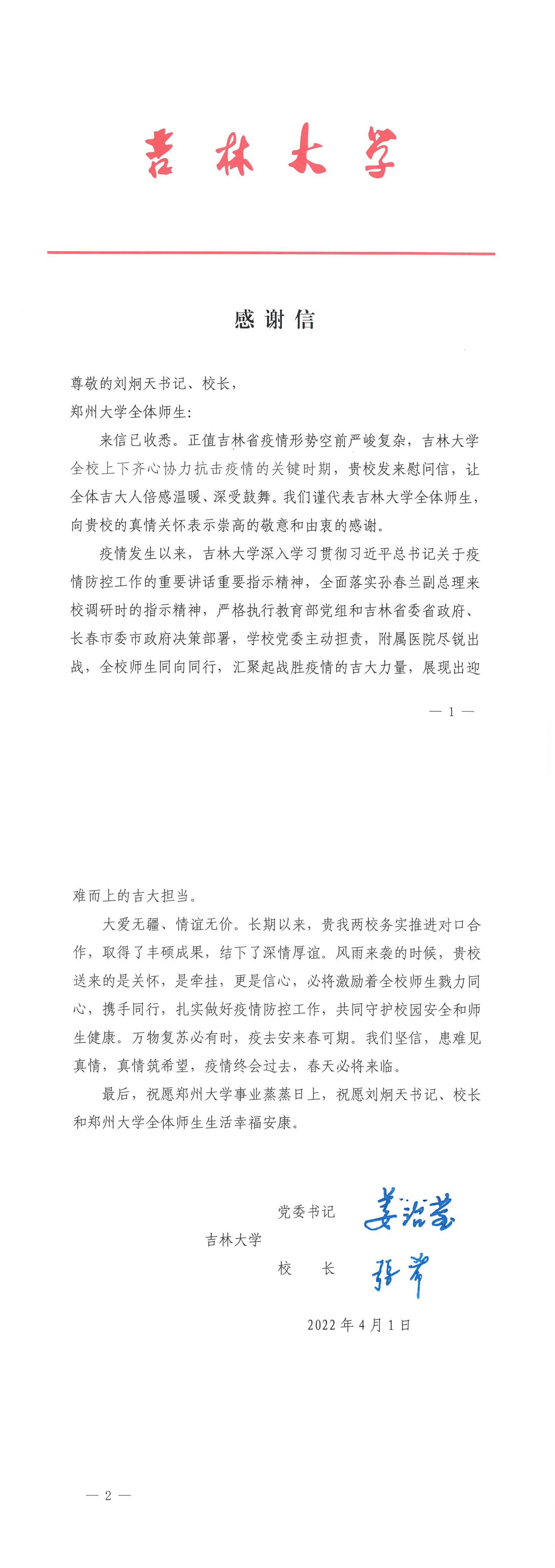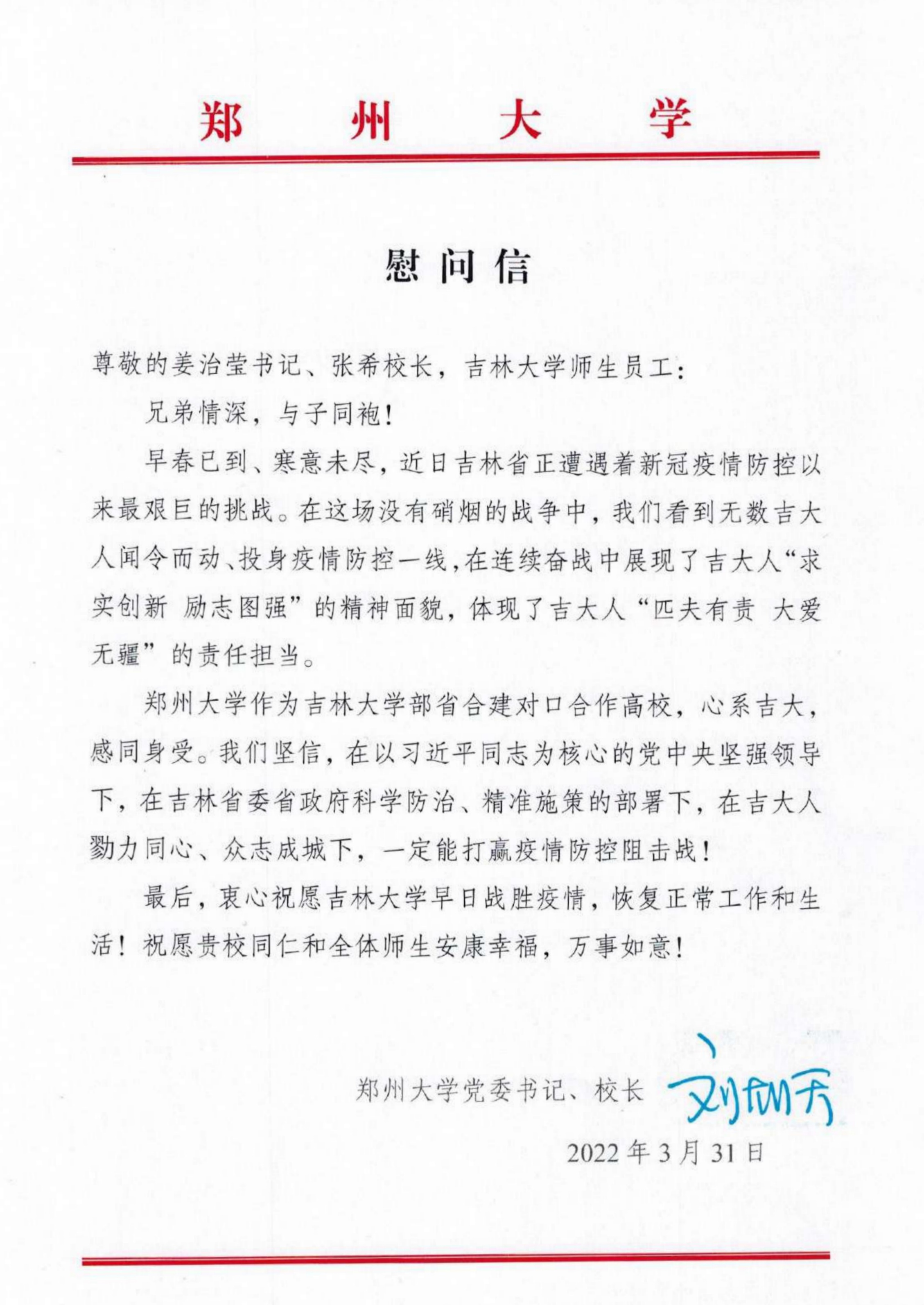 4月1日,吉林大学向best365英国在线体育官网发来感谢信。信中表示,在吉林大学全校上下齐心协力抗击疫情的关键时期,郑大发来慰问信,让全体吉大人倍感温暖,深受鼓舞,并向郑大的真情关怀致以崇高的敬意和由衷的感谢。信中指出。风雨来袭的时候,郑大送来的是关怀,是牵挂,更是信心,必将激励着吉大全校师生戮力同心,携手同行,扎实做好疫情防控工作,共同守护校园安全和师生健康。信中还祝愿best365英国在线体育官网事业蒸蒸日上,全体师生生活幸福安康。