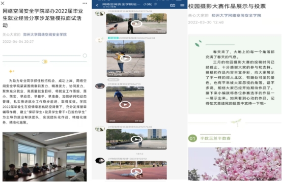 封闭的校园阻挡不了学院师生丰富学习生活的热情。学院聚焦科学防控、倡导健康生活,以丰富课余文化活动为导向,以打造精彩线上活动为抓手,打造健康有益、丰富多彩的课余文化生活。学院发起为“毕业班加油”的送祝福活动,同学们通过视频、文字为毕业生就业、考研送上支持和祝福;举办毕业生就业分享沙龙暨模拟面试活动,建立“保研学生+党员骨干+已签约学生”为主导的就业帮扶团队,营造就业氛围、关爱重点群体、强化典型宣传;组织“315权益知识”线上答题活动,鼓励学生提升自我保护意识、权利意识,维护和谐的校园环境;开展“运动健康打卡”系列活动,每日积极打卡强身健体;策划线上心理微剧本大赛、摄影大赛等丰富的校园文化活动,让同学们在校生活中展示自我、绽放青春光彩。