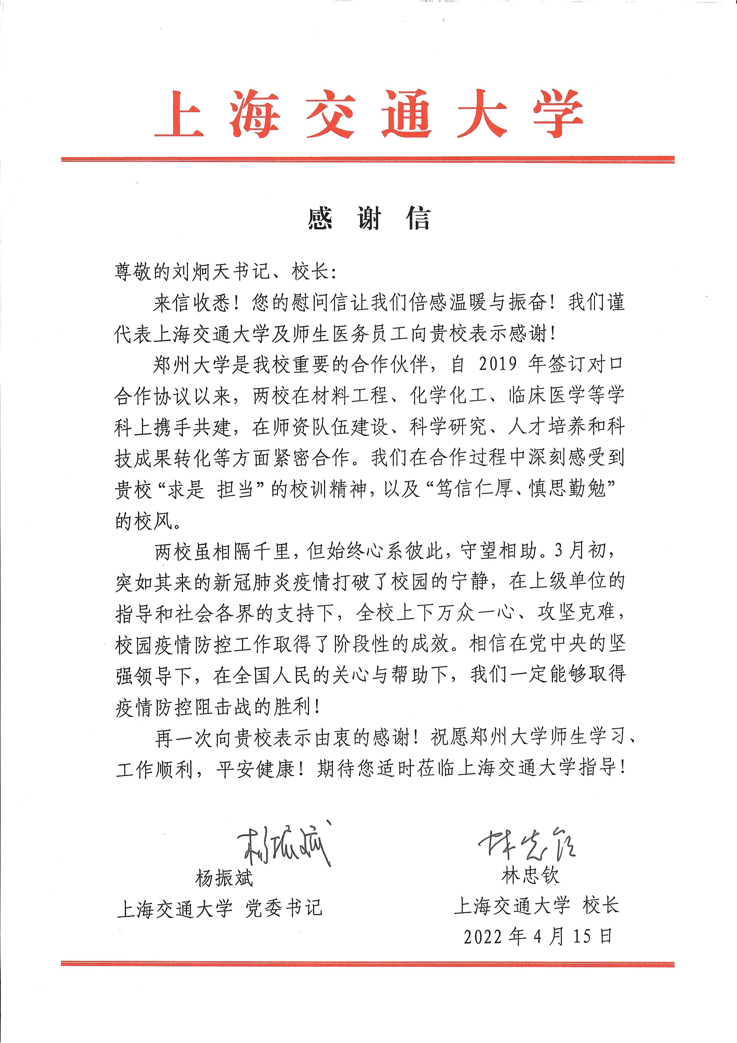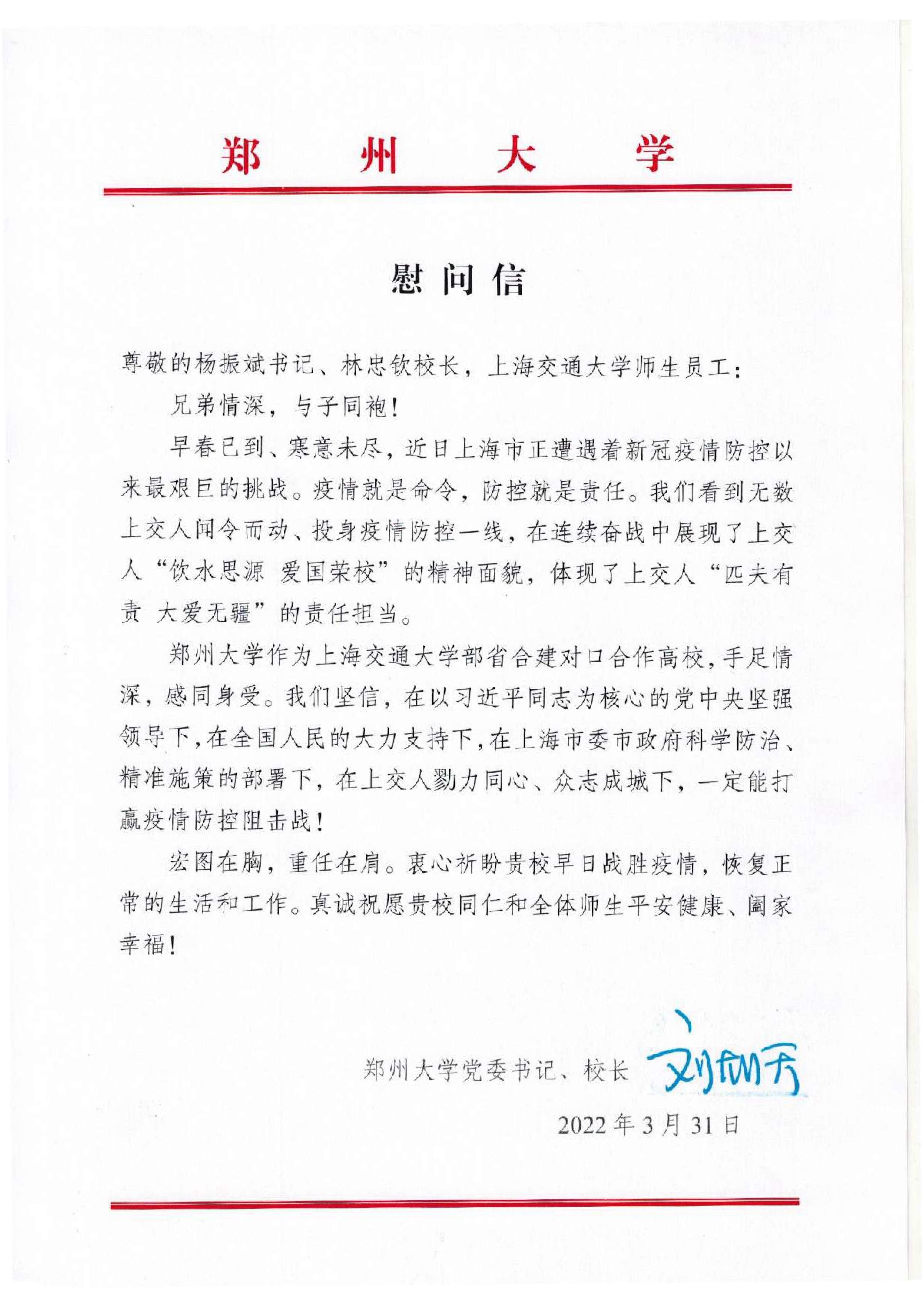 近期,上海市正处于疫情高位流行状态。上海交通大学和best365英国在线体育官网是部省合建对口合建合作高校,3月31日,省政协副主席、校党委书记、校长刘炯天代表学校,向上海交通大学全体师生员工发去慰问信,衷心祝愿上海交通大学早日战胜疫情,恢复正常生活和工作,真诚祝愿上海交通大学全体师生平安健康、阖家幸福。