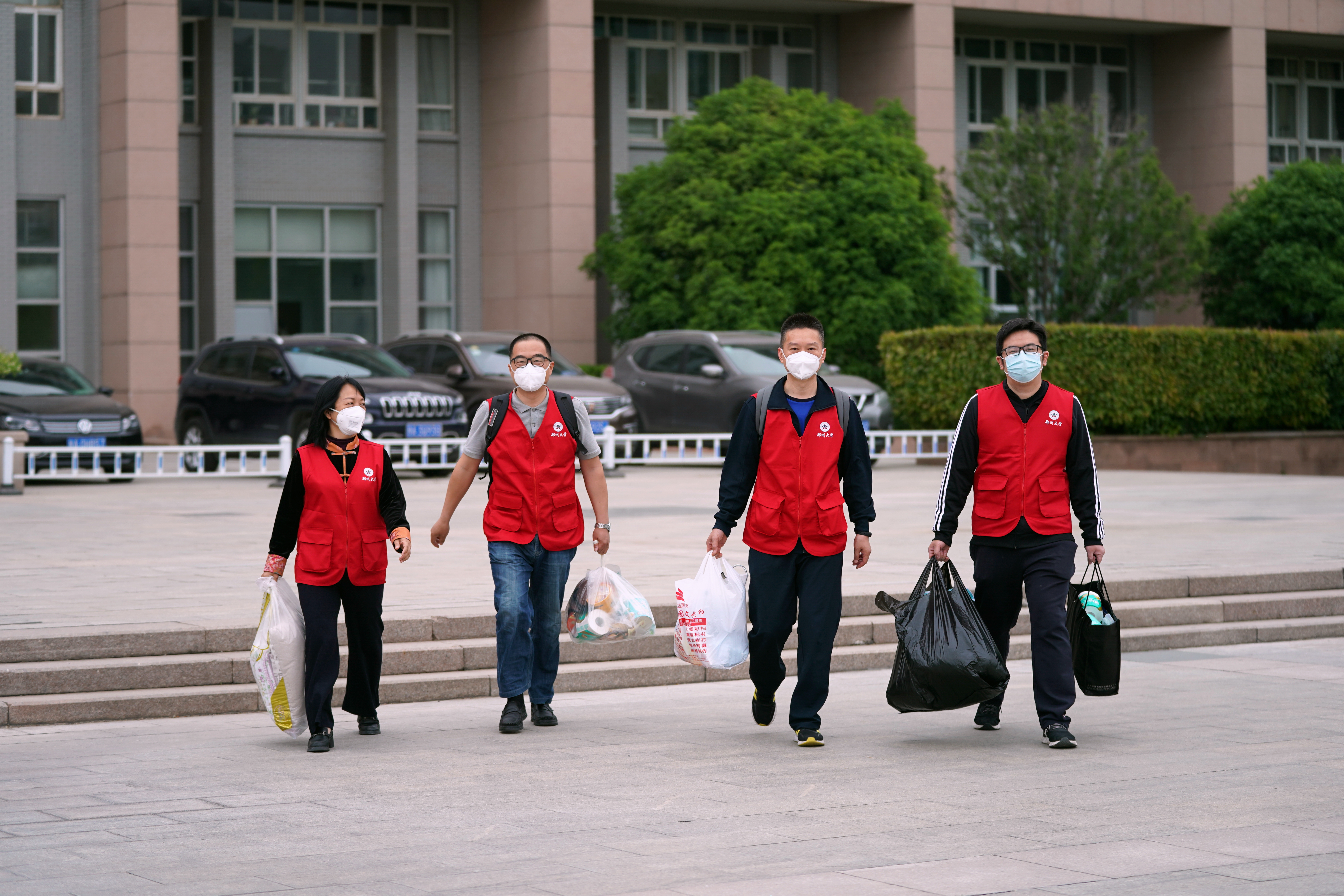 温馨服务,靓丽“大红”。机关党员志愿者们身着红马甲,分组在柳园、荷园、菊园、松园和图书馆等地,维持核酸检测队伍,在餐厅前帮着学生取餐,投入最前沿,与楼长们并肩作战。5月7日,郑州气温从31度陡降至19度,机关党员志愿者坚持在主校区师生核酸检测点、学生餐厅取餐点现场维护秩序,做好引导工作。不时劝说学生们注意保持安全距离,看到个别学生穿的太单薄,亲切地提醒“上楼加件衣服再来”“原地做操运动,千万别冻感冒了”。机关在岗值守的人员夜以继日地工作,往往顾不上吃饭,年轻的党员志愿者又主动承担起为同志们取餐送餐的任务,一边每天在学生生活园区志愿服务,一边还要赶紧去餐厅取餐,统计每顿用餐人数,打包分装,提醒吃饭,关心到机关每一位值班同志,不拉下一人,他们忙起来的时候脚不沾地,满头是汗。他们把餐食送到每一位在岗值守机关工作人员手中,也把同舟共济、战胜疫情的坚定信心传递到每一位师生心中。机关党委还为入住人才公寓的志愿者们送去了水果、蔬菜、泡面等慰问品,表达对同志们的关心和问候。如今,作为机关党员志愿者,这些穿着红马甲往来奔忙的“大红”们,已经被越来越多的师生所喜爱和信赖。