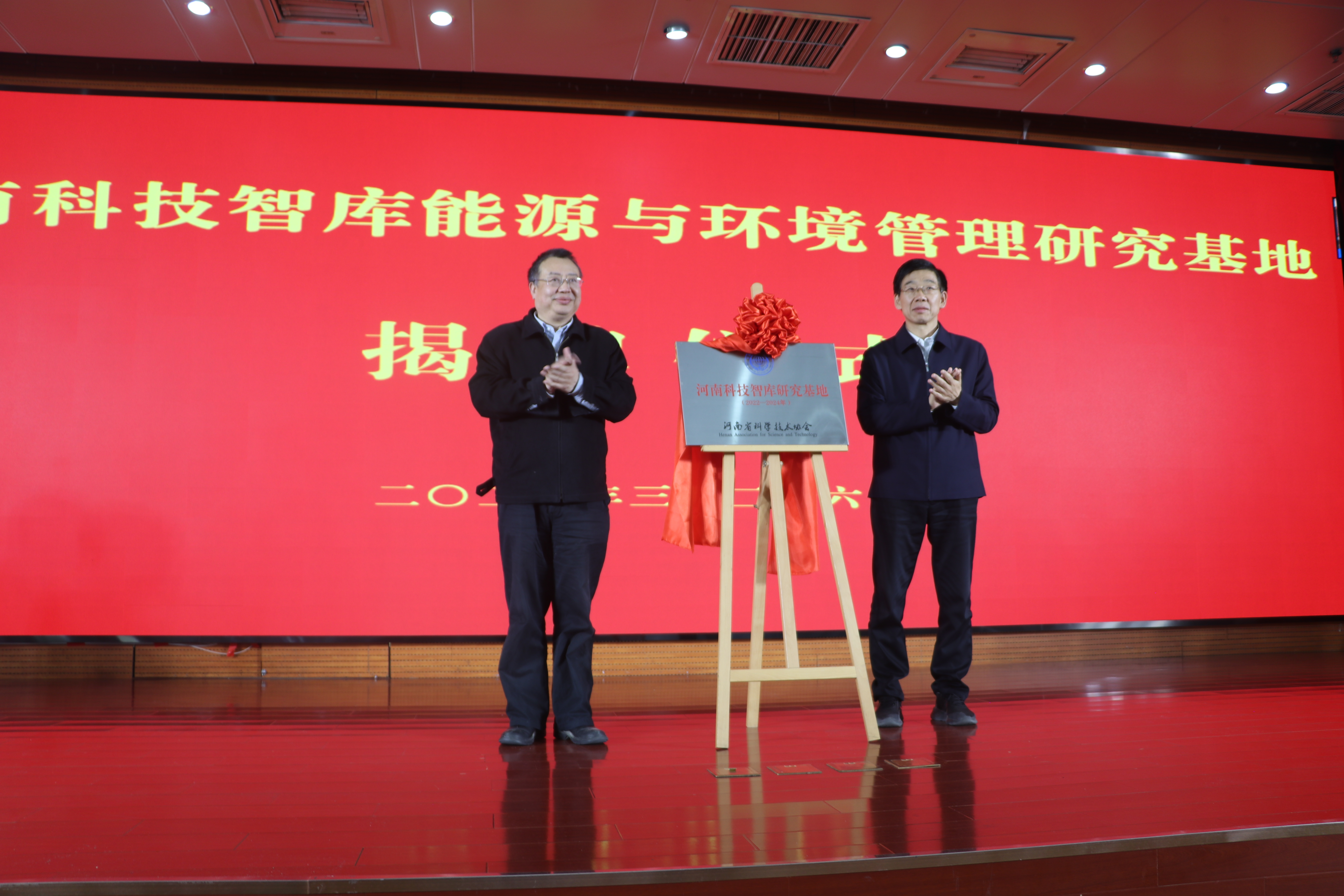屈凌波和吕国范共同为河南科技智库能源与环境管理研究基地揭牌。