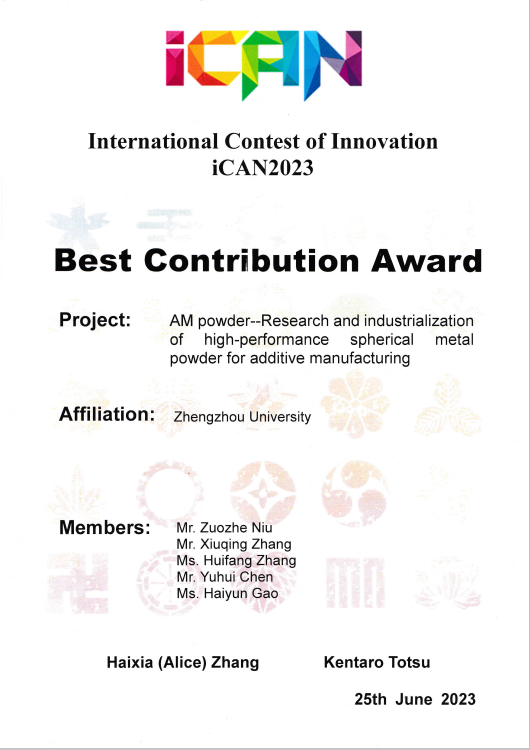 近期,iCAN国际创新创业大赛在日本京都大学举办。best365英国在线体育官网同北京理工大学等学校一起代表中国参赛,同来自德国、日本、泰国3个国家22个项目同台竞技。材料科学与工程学院郝振华、舒永春老师指导,学生牛作哲、张秀庆、张慧芳、陈育辉、高海韵团队凭借参赛作品“埃姆粉材:增材制造用高性能球形金属粉末的研发与产业化”在国际总决赛中获得最佳贡献奖。