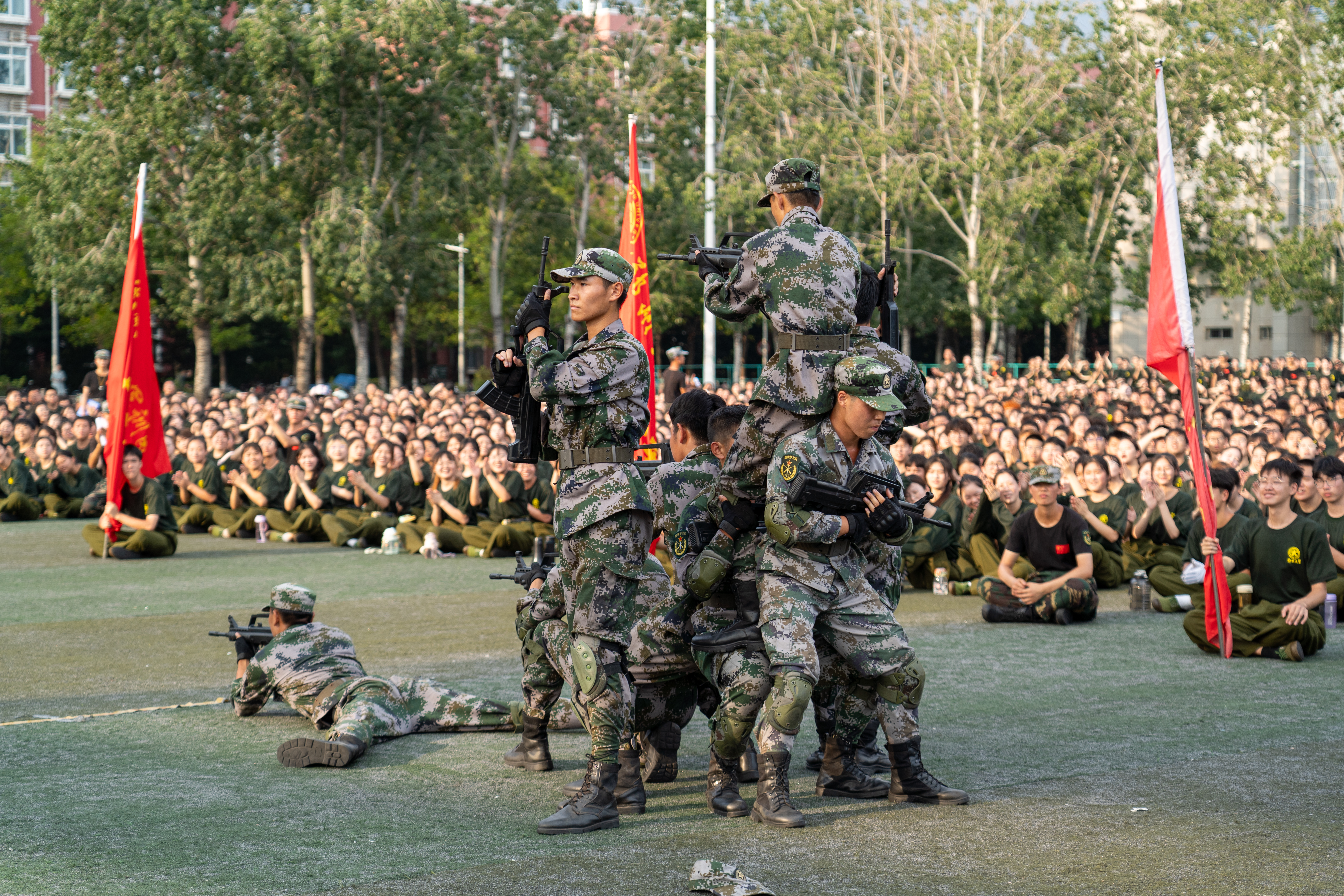 今年暑期小学期学校组织了2021级和2022级两期补训工作,训练内容涉及队列、方队、军体拳、匕首操、战术、内务整理等项目。训练期间,军训团精心组织,科学施训,严格要求,工作人员和参训同学一起战高温、斗酷暑,全程在训练场上做好安全保障工作;各相关单位通力协作、密切配合,为参训学生提供了良好服务。通过集中军训,同学们进一步提高了思想政治觉悟,极大激发了爱国热情,增强了关心国防、热爱国防、建设国防、保卫国防的坚定信念和坚强决心。(陈宇翔 摄影)