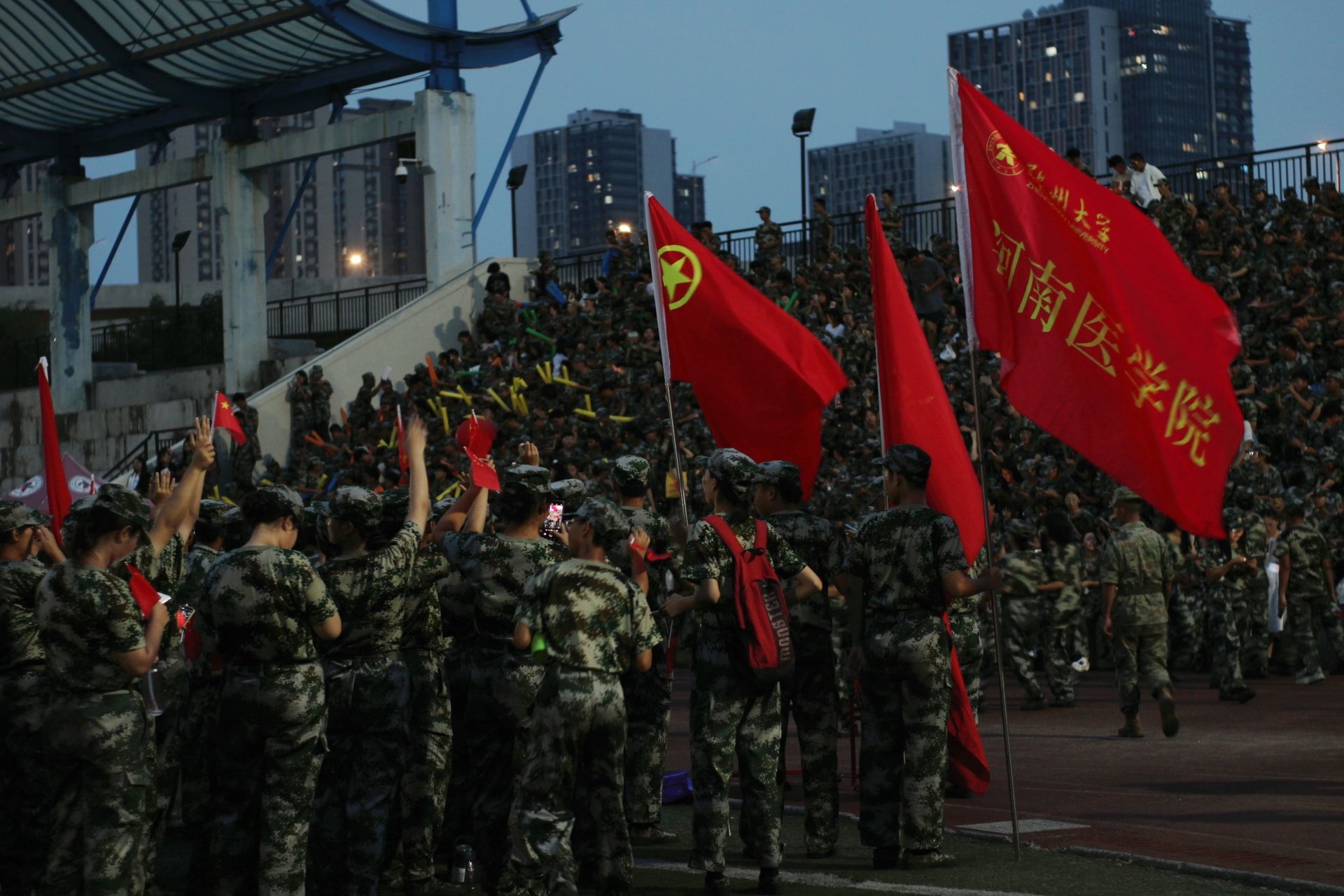 军歌嘹亮直冲云霄,斗志昂扬誓比天高。伴随着阵阵鼓声,参赛的21支比赛队伍精神抖擞,嘹亮的歌声响彻校园。《打靶归来》《保卫黄河》《强军战歌》《歌唱祖国》《没有共产党就没有新中国》等歌曲慷慨激昂。各连队别出心裁,将舞蹈、舞狮等元素融入表演,现场的旗帜挥舞、横幅飘动,更是将比赛氛围推上高潮。伴着击鼓敲锣的节拍,在场同学们纷纷挥舞着手中的荧光棒和闪光灯,为参赛连队喝彩加油。