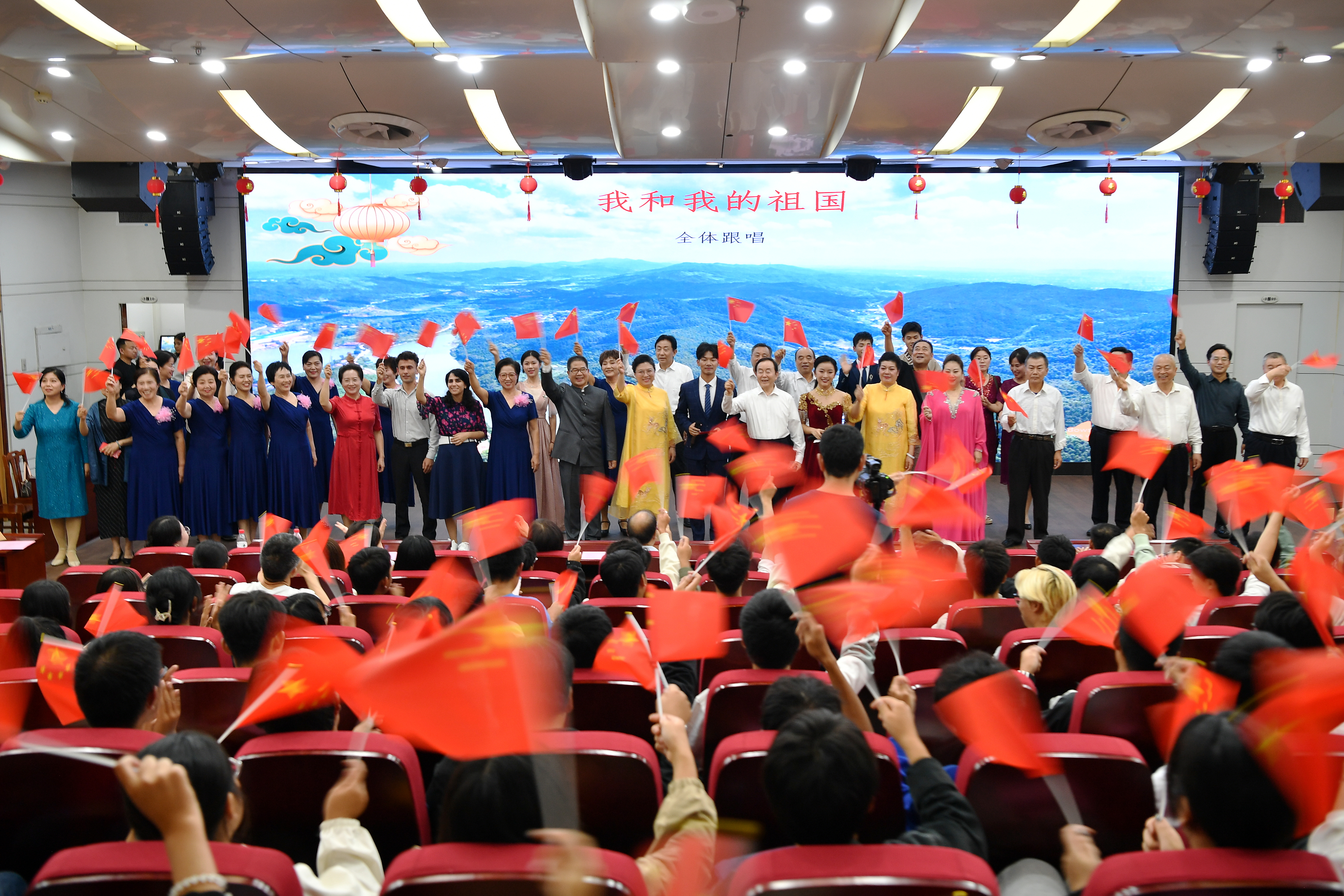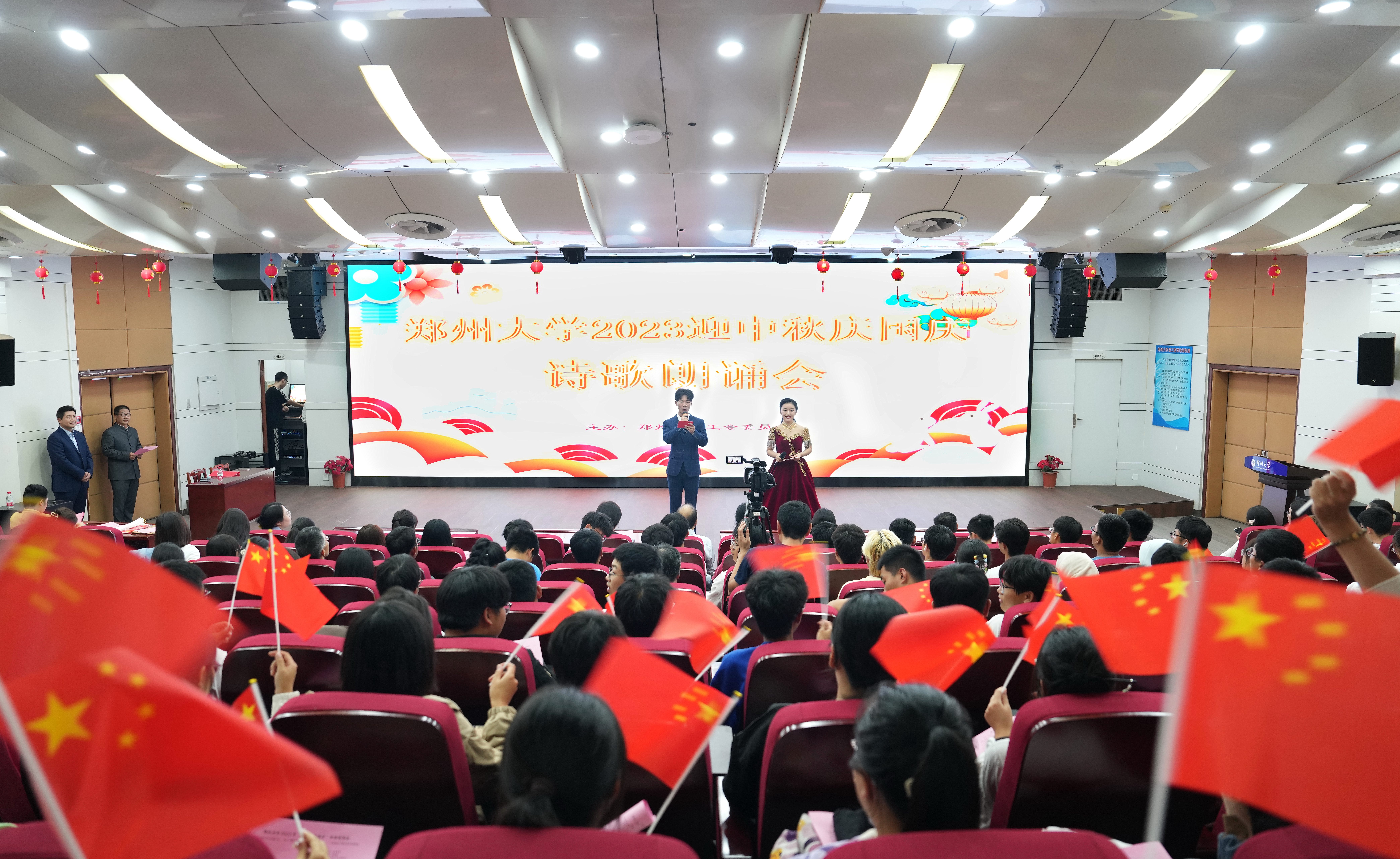 诗会以新闻与传播学院陈卓老师朗诵的《祝福》拉开了序幕。教务处吴艳利、张君静老师倾情演绎现代诗篇《秋天》,给现场观众描绘了一幅绚丽多彩的乡村秋景图;离退休工作处刘建莉、陈华艳老师,气势磅礴地朗诵了《我骄傲我是中国人》,收获台下观众的热烈掌声。校纪委胡泓老师朗诵了诗歌《水调歌头》,用经典表达中国人亘古不变的团圆心愿;音乐学院蒋涵老师以一首《望月》深情诉说对亲人的无尽思念;国际教育学院塔吉克斯坦籍学生王宁倾情朗诵了《沁园春·长沙》;审计处杨国祥老师用一篇《人民万岁》表达了对中国精神的敬仰。最后,全体演员和在场的观众合唱《我和我的祖国》,共同祝福祖国生日快乐。