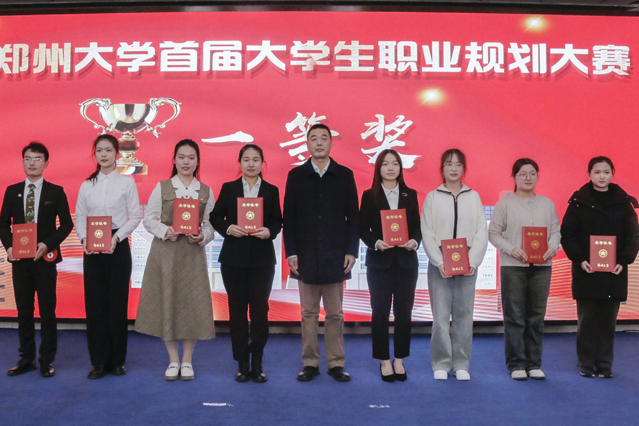 大赛现场,选手依次登台展示,20名选手分别围绕各自职业目标作主题陈述,分别结合生涯发展报告、个人求职意向和职业准备情况展示职业规划,并对专家评委的提问作出应答,现场用人单位根据选手表现给出实习意向或录用意向。经过激烈角逐,大赛成长赛道、就业赛道共评选出一等奖8名,二等奖12名。吴宏阳等与会领导为获奖选手颁奖。