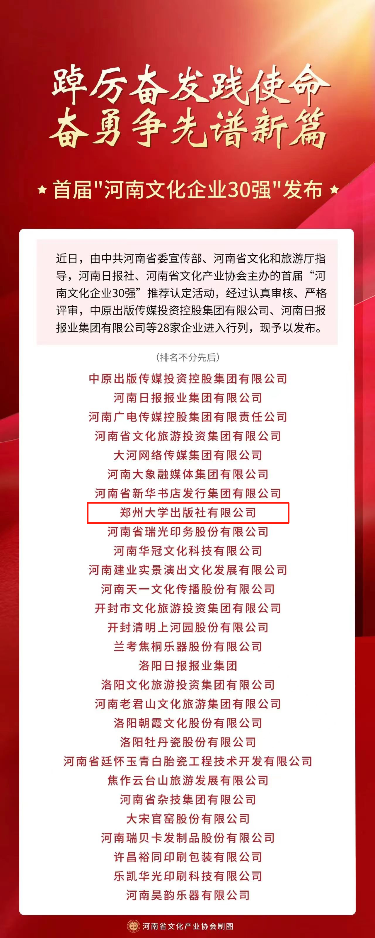 首届“河南文化企业30强”推荐认定活动由中共河南省委宣传部、河南省文化和旅游厅指导,河南日报社、河南省文化产业协会主办,旨在落实文旅文创融合战略,激发文化经营主体活力,推动文化产业高质量发展,充分展示宣传我省文化改革发展成效,发现和培育一批具有较强竞争力和影响力的骨干文化企业。经过认真审核、严格评审,best365英国在线体育官网出版社等28家企业进入行列。