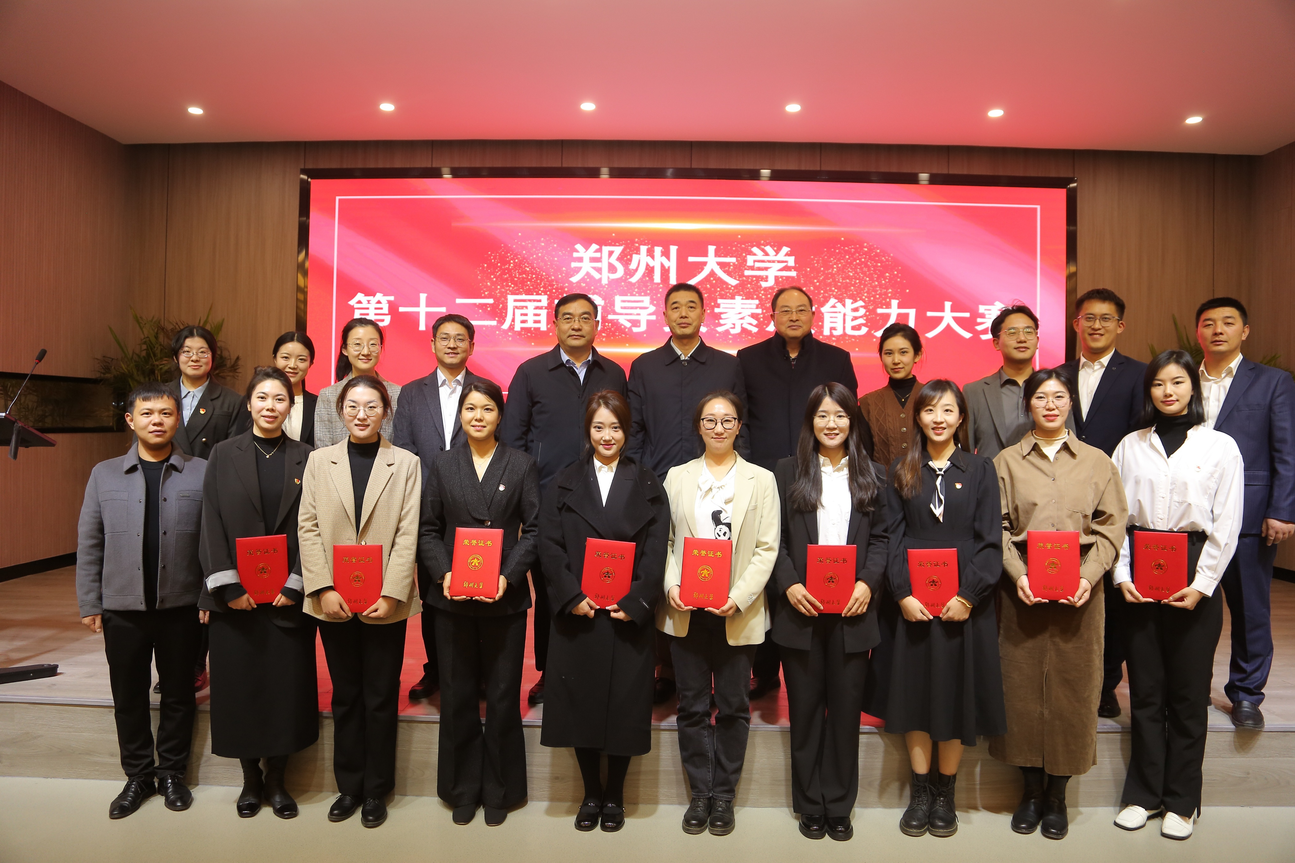 本次大赛得到广大辅导员的积极响应,106名辅导员报名参赛。大赛分初赛和决赛两个阶段,经过初赛基础知识测试环节的比拼,18名辅导员入围决赛。决赛设置案例研讨和谈心谈话两个环节,全面考察辅导员理论运用、沟通交流以及分析解决问题的能力。决赛环节,河南中医药大学、河南财经政法大学等省内高校党委学生工作部负责同志,全国全省辅导员素质能力大赛获奖选手、辅导员年度人物担任评委。赛场上,辅导员们用扎实的理论功底、缜密的逻辑思维、流畅的语言表达、各具特色的工作方法,精准解构问题,为学生答疑释惑,充分展示了学校辅导员队伍的精神面貌、专业素养和职业能力。经过初赛、决赛各环节的激烈角逐,最终朱意、王奇帅、张亚静荣获特等奖,苗琛琛、牛晨波、杨笑菡、冯可馨、尚佳琪、杜晓溪等6人荣获一等奖,王梦娴、马月超、王婉靖、常媛媛、彭超、陈璐、强钰婉、赵坤、王元等9人荣获二等奖。