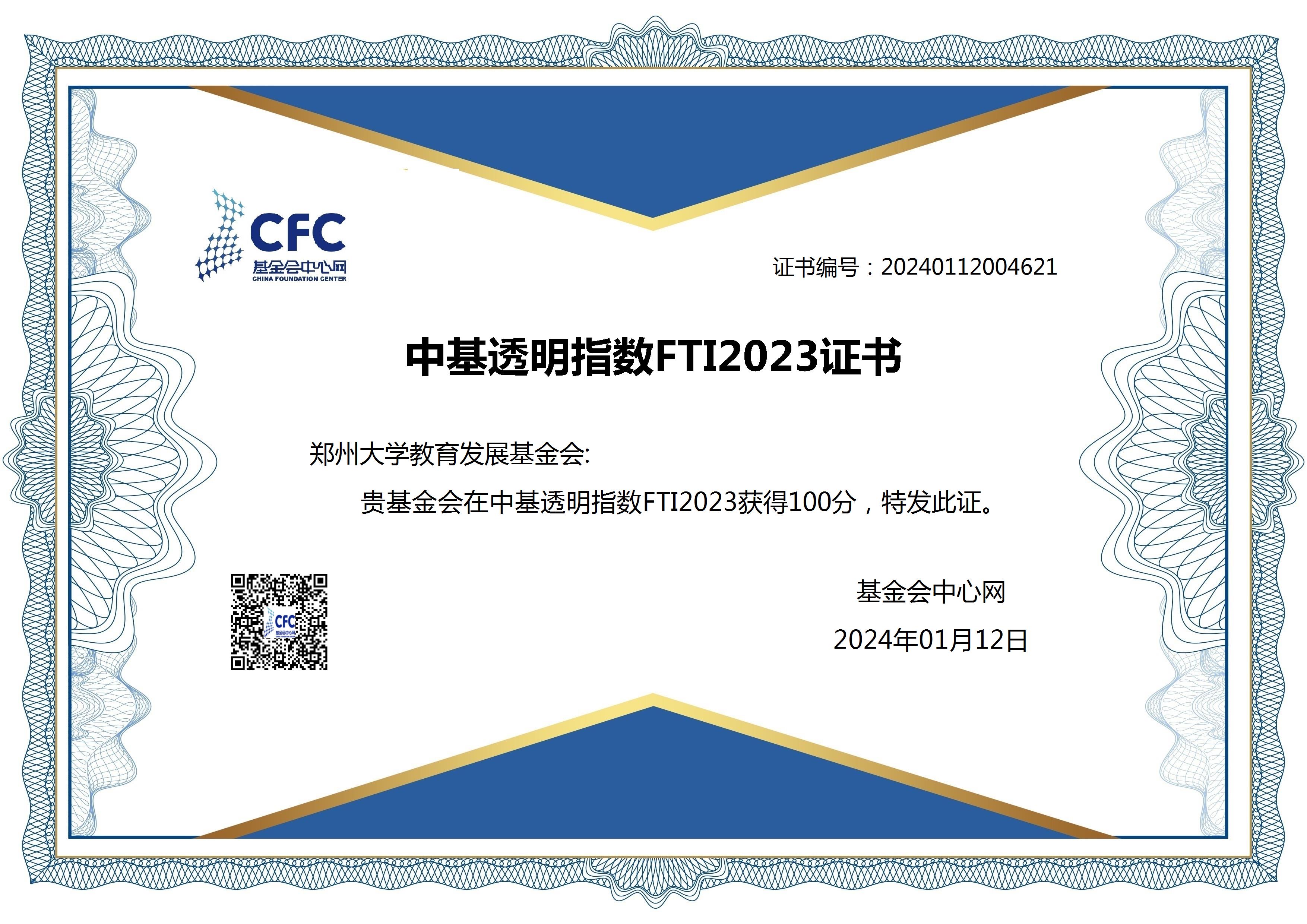 best365英国在线体育官网教育发展基金会 中基透明指数FTI2023证书