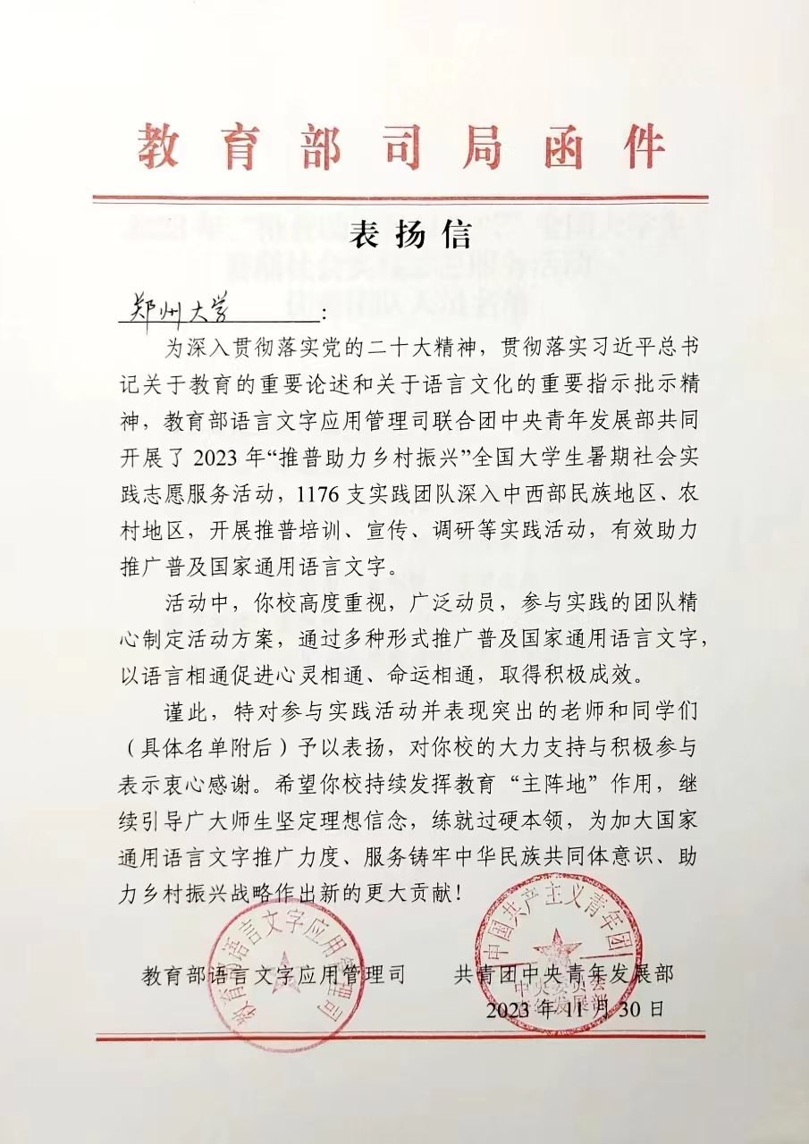 信中指出,在2023 年“推普助力乡村振兴”全国大学生暑期社会实践志愿服务活动中,best365英国在线体育官网高度重视、广泛动员,参与实践的团队精心制定活动方案,通过多种形式推广普及国家通用语言文字以语言相通促进心灵相通、命运相通,取得积极成效。信中特对参与实践活动并表现突出的师生们予以表扬,对best365英国在线体育官网的大力支持与积极参与表示衷心感谢。信中希望best365英国在线体育官网持续发挥教育“主阵地”作用,继续引导广大师生坚定理想信念,练就过硬本领,为加大国家通用语言文字推广力度、铸牢中华民族共同体意识、助力乡村振兴战略作出新的更大贡献。