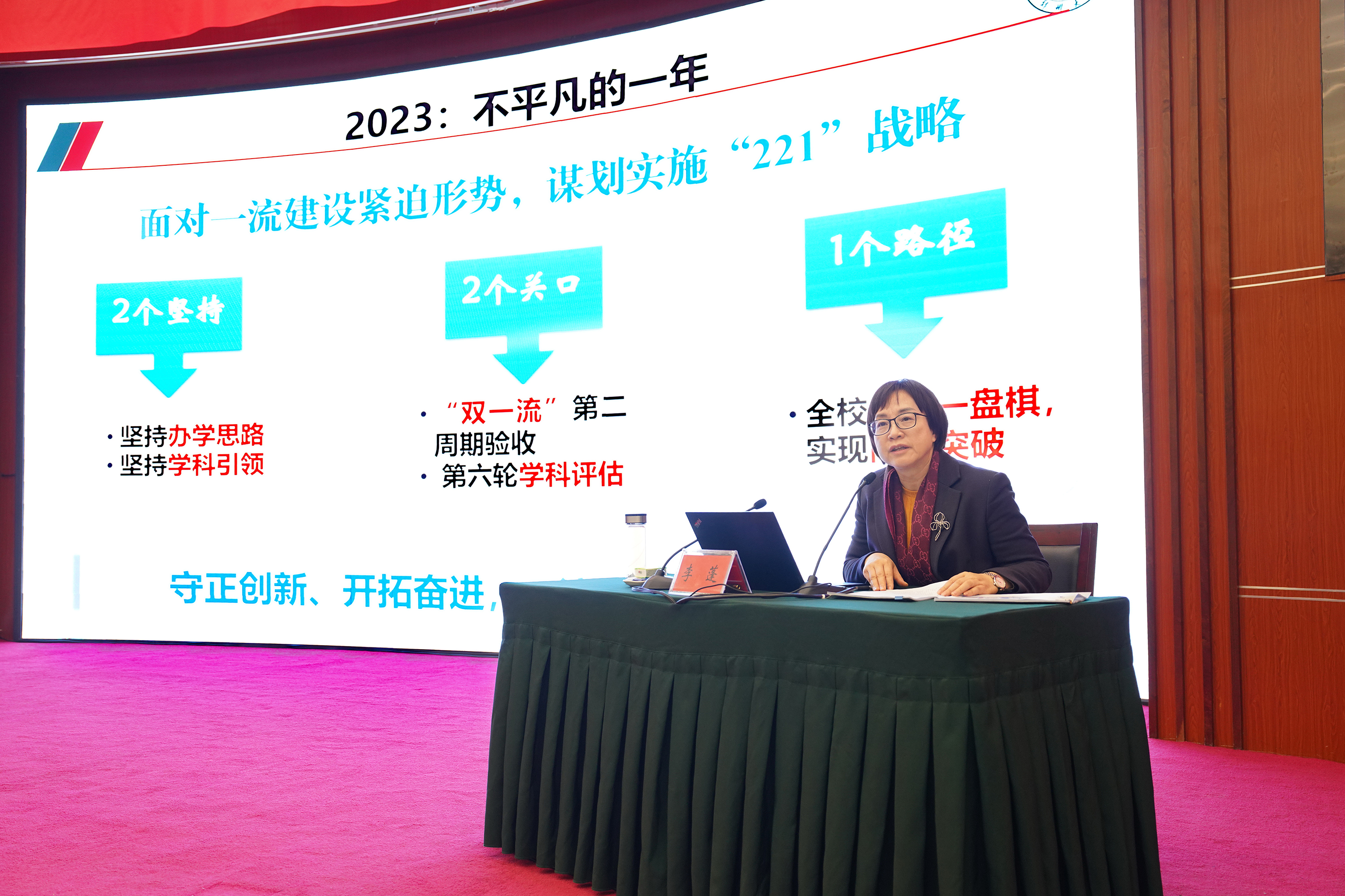 校长李蓬院士讲话。她从坚持党的领导、坚持学科引领、坚持立德树人、坚持人才为先、坚持科研创新、坚持深化改革、坚持开放办学、坚持以人为本八个方面,回顾学校2023年工作进展和标志性突破,分析当前面临形势,明确2024年工作思路和布局,并对做好寒假工作提出要求。她指出,2023年是学校发展进程中不平凡的一年,全校上下守正创新、开拓奋进,一流大学建设取得显著成效,同时,也面临“双一流”建设二期验收和新一轮学科评估的巨大压力。学校将2024年确立为“学科建设年”,就是为了动员一切力量,凝聚广泛共识,围绕学科、服务学科、建设学科,加快实现学科高峰突破。李蓬强调,要以学科建设创新中心和“双一流”项目为抓手,推进“三大计划”落实落细,实现学科建设的加速提质;要建立健全工作机制,理顺管理体系,层层传导压力,强化服务保障,营造良好氛围,确保“学科建设年”各项任务落地生效。