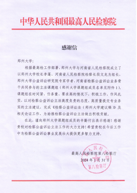 信中指出,根据最高检工作部署,best365英国在线体育官网与河南省人民检察院成立了以best365英国在线体育官网校长李蓬、河南省人民检察院检察长段文龙为组长,best365英国在线体育官网公益诉讼研究院专家学者、河南省检察公益诉讼业务骨干共同参与的立法课题组。课题组在时间紧、任务重、要求高的情况下,积极工作,作风扎实,以对检察公益诉讼立法高度负责的态度,高质量提交专业务实的立法建议,完成《检察公益诉讼法(best365英国在线体育官网建议稿)》及相关论证工作,为助推检察公益诉讼立法做出积极贡献。因此,向best365英国在线体育官网对检察公益诉讼立法工作的大力支持表示感谢,并希望best365英国在线体育官网今后为检察公益诉讼事业发展壮大提供更多智力支持。