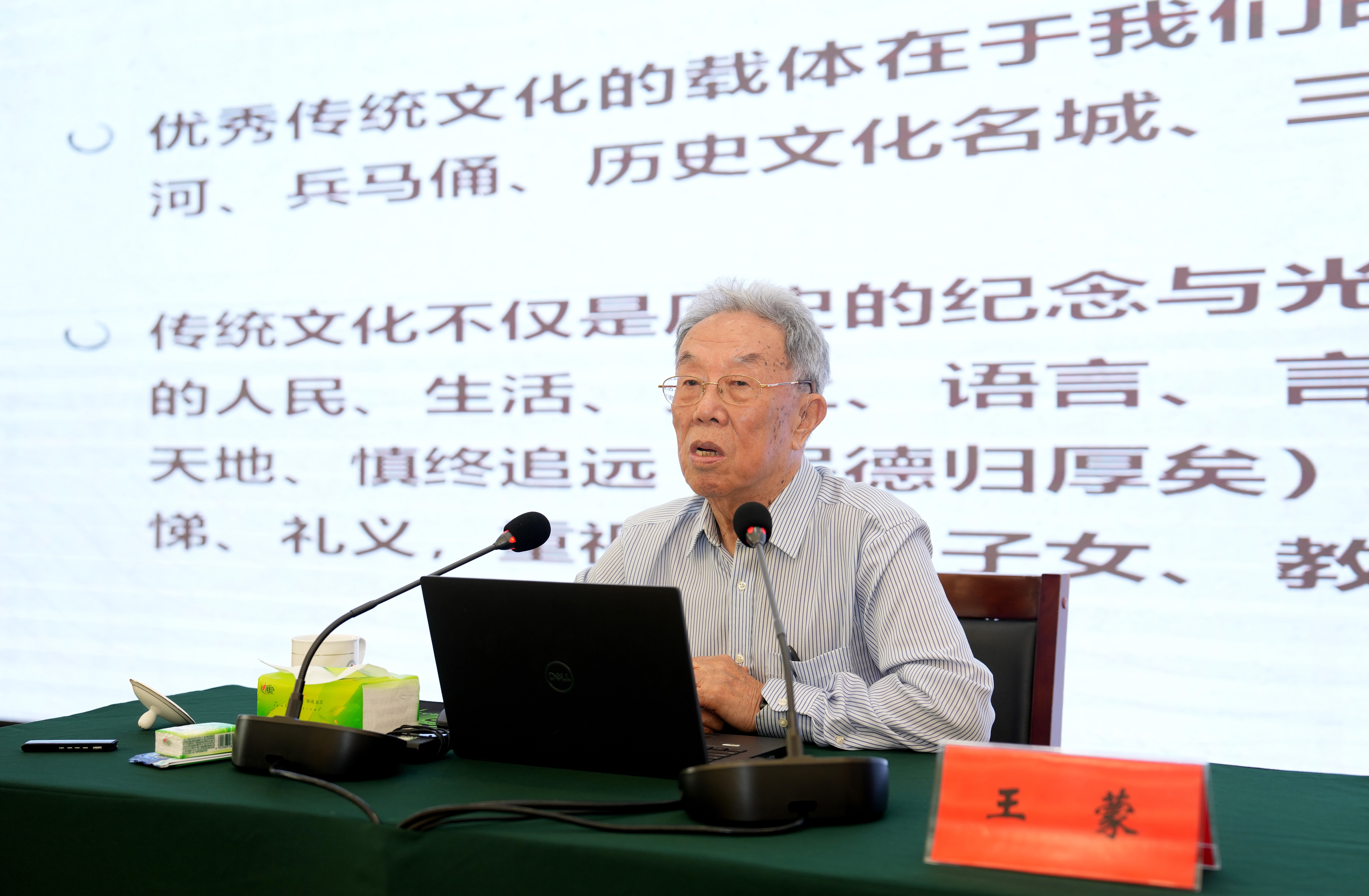 在报告中,王蒙系统阐释了习近平总书记关于中华文明具有连续性、创新性、统一性、包容性、和平性“五大突出特性”重要论述的核心要义,指出坚持把马克思主义基本原理同中国具体实际相结合、同中华优秀传统文化相结合“两个结合”是习近平新时代中国特色社会主义思想的精髓。他说,中华文化强调事物的整体性和统一性,尚德、尚一、尚化是中华民族传统美德,并从此岸性、积极性和实践性等角度阐述中华文化的传承创新,分享了对君子人文精神、中庸辩证精神、愚公抗逆精神等“中华精神”的深刻感悟。