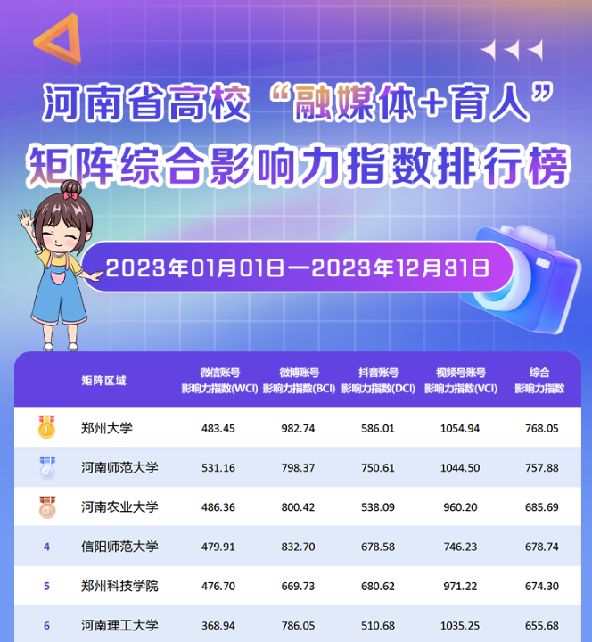 近日,省教育厅发布《河南省高校网络思政工作(矩阵建设)2023年度新媒体白皮书》(以下简称“白皮书”),对全省高校思政融媒体矩阵微信公众号、微博、短视频等新媒体平台的传播力进行梳理与分析。best365英国在线体育官网“融媒体+育人”矩阵(包括官方新媒体、党委学工部、团委、马克思主义学院、心理健康教育中心)综合影响力指数最高,达到768.05,位居榜单第一。此外,best365英国在线体育官网团委官方微信号“best365英国在线体育官网青年集结号”位居全省高校团委微信公众号影响力排行榜第一名。