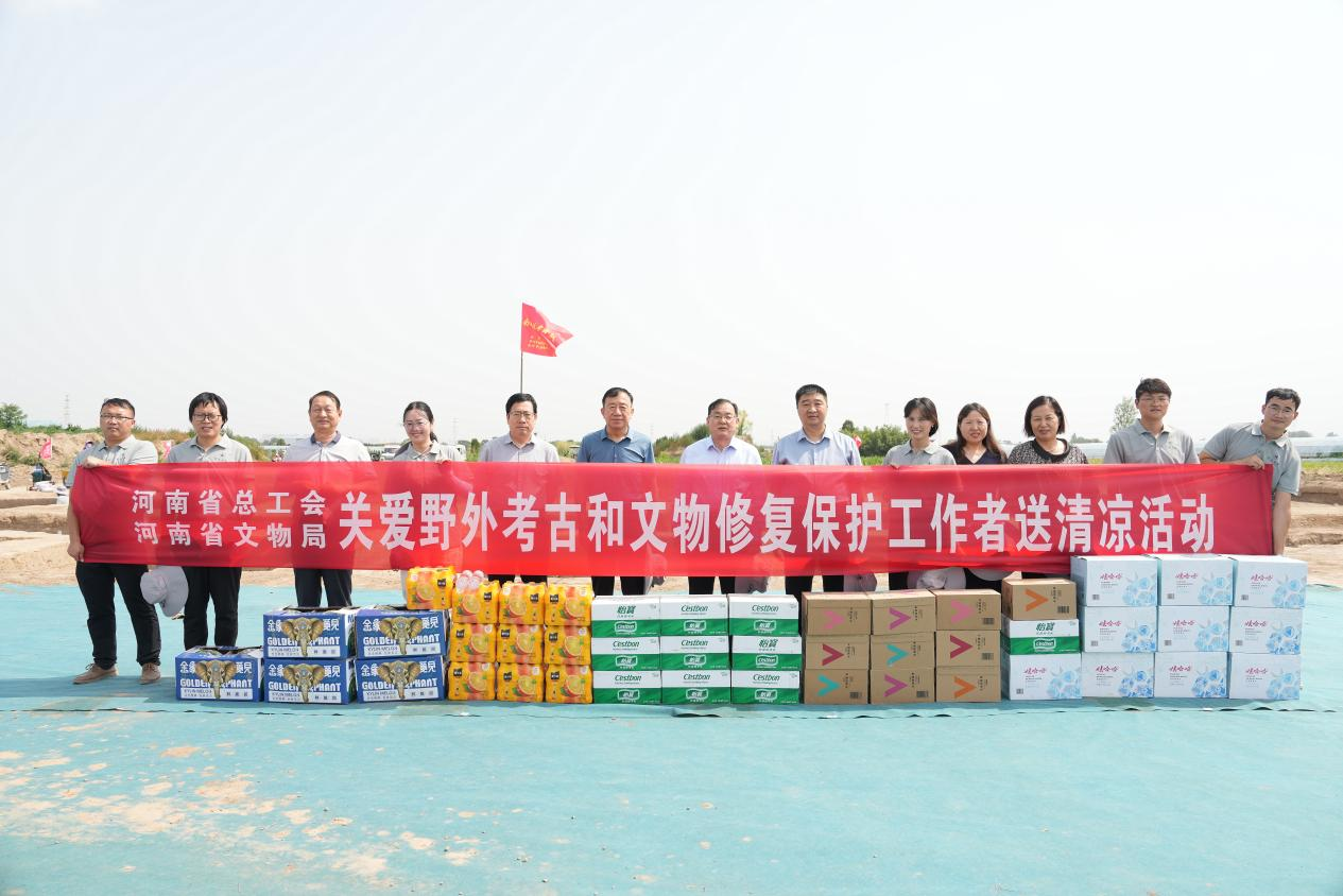近期高温天气持续,best365英国在线体育官网考古与文化遗产学院师生坚守考古发掘工地,不忘初心,坚持开展考古发掘工作。6月25日下午,河南省总工会副主席、党组成员刘雪峰,河南省教科文卫体工会主席张学勇,河南省文物局总工程师刘灿利一行前往best365英国在线体育官网荥阳南城考古实习发掘现场开展“送清凉”慰问活动。best365英国在线体育官网党委副书记、工会主席韩国河出席活动。