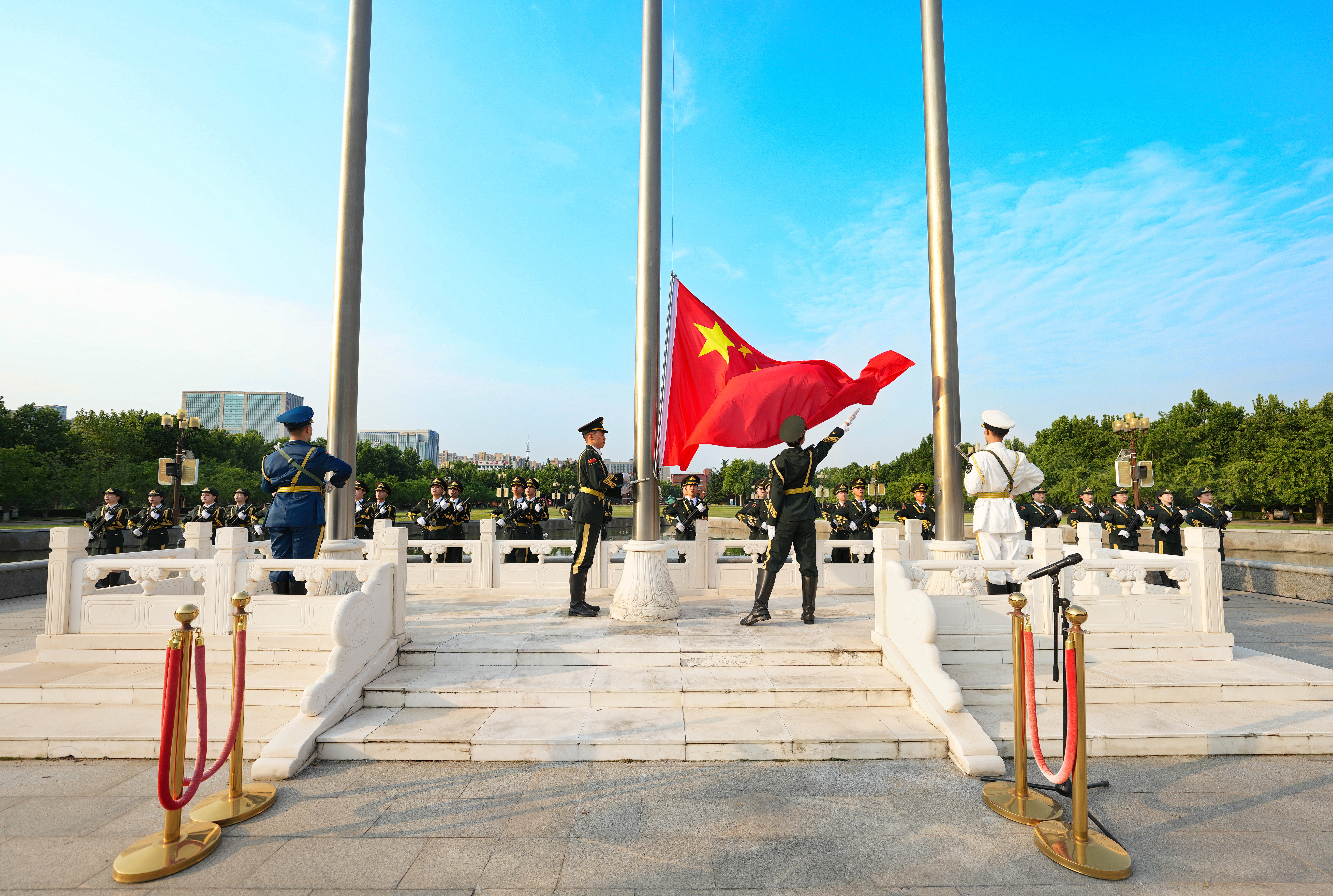国旗护卫队身着戎装、手握钢枪,迈着铿锵有力的步伐走向升旗台。仪仗标兵列队升旗台旁,持枪伫立。伴随着雄壮的《义勇军进行曲》,鲜艳的五星红旗冉冉升起,在晨曦中迎风飘扬。全场师生肃然起敬,面向国旗行注目礼,齐唱国歌。