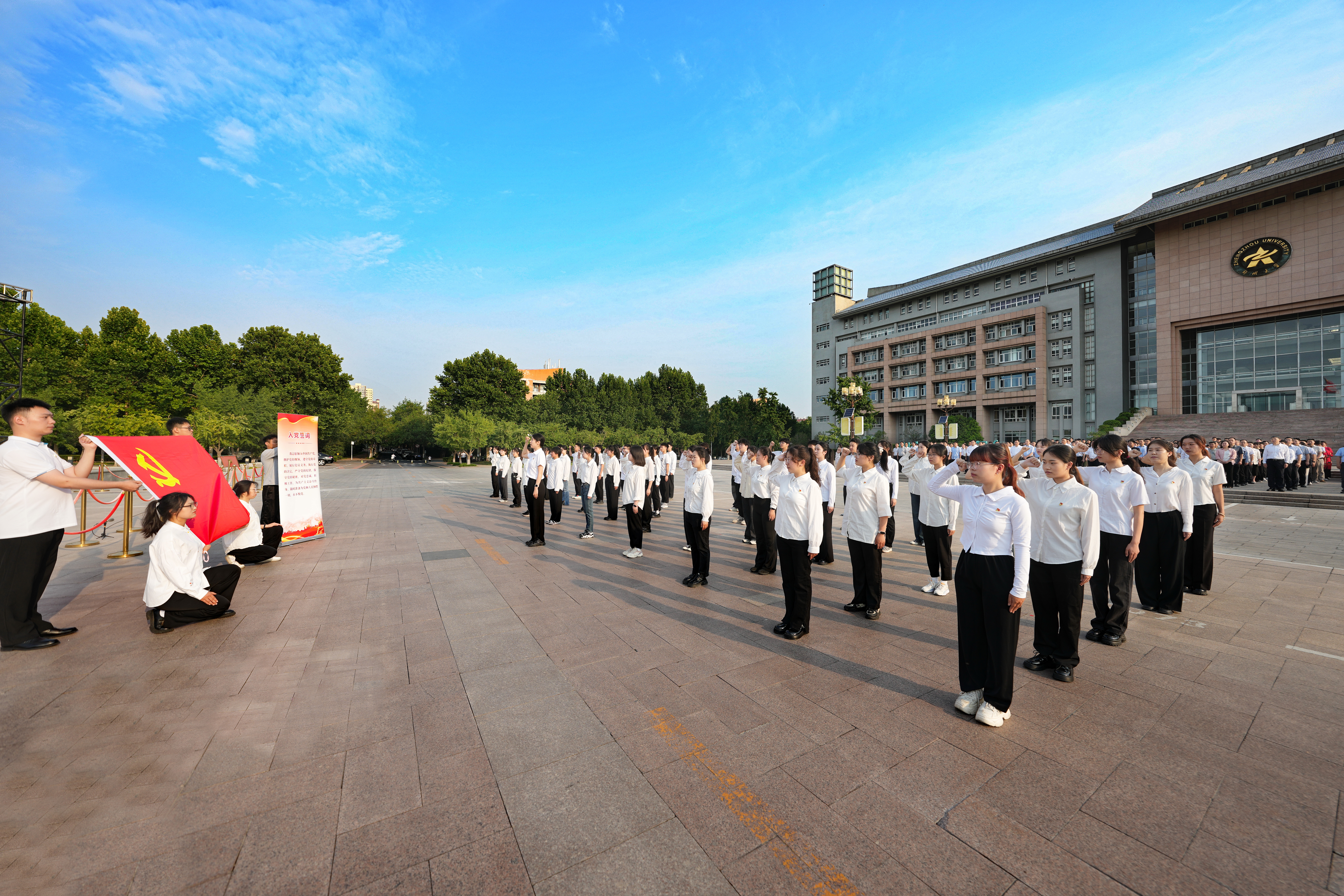 随后,基础医学院党员和教师代表饱含深情地朗诵《青春中国》,祝愿伟大的中国共产党永葆青春,祖国的明天更加繁荣富强!新入党党员代表在国旗下高举右拳,庄严宣誓,坚定为共产主义奋斗终身的信念。青年学生党员代表排列成“103”字样,挥舞手中国旗,表达“请党放心,强国有我!”的心声,为党的生日献礼。铿锵誓言响彻校园上空,传递出郑大学子对党和国家的深情告白。