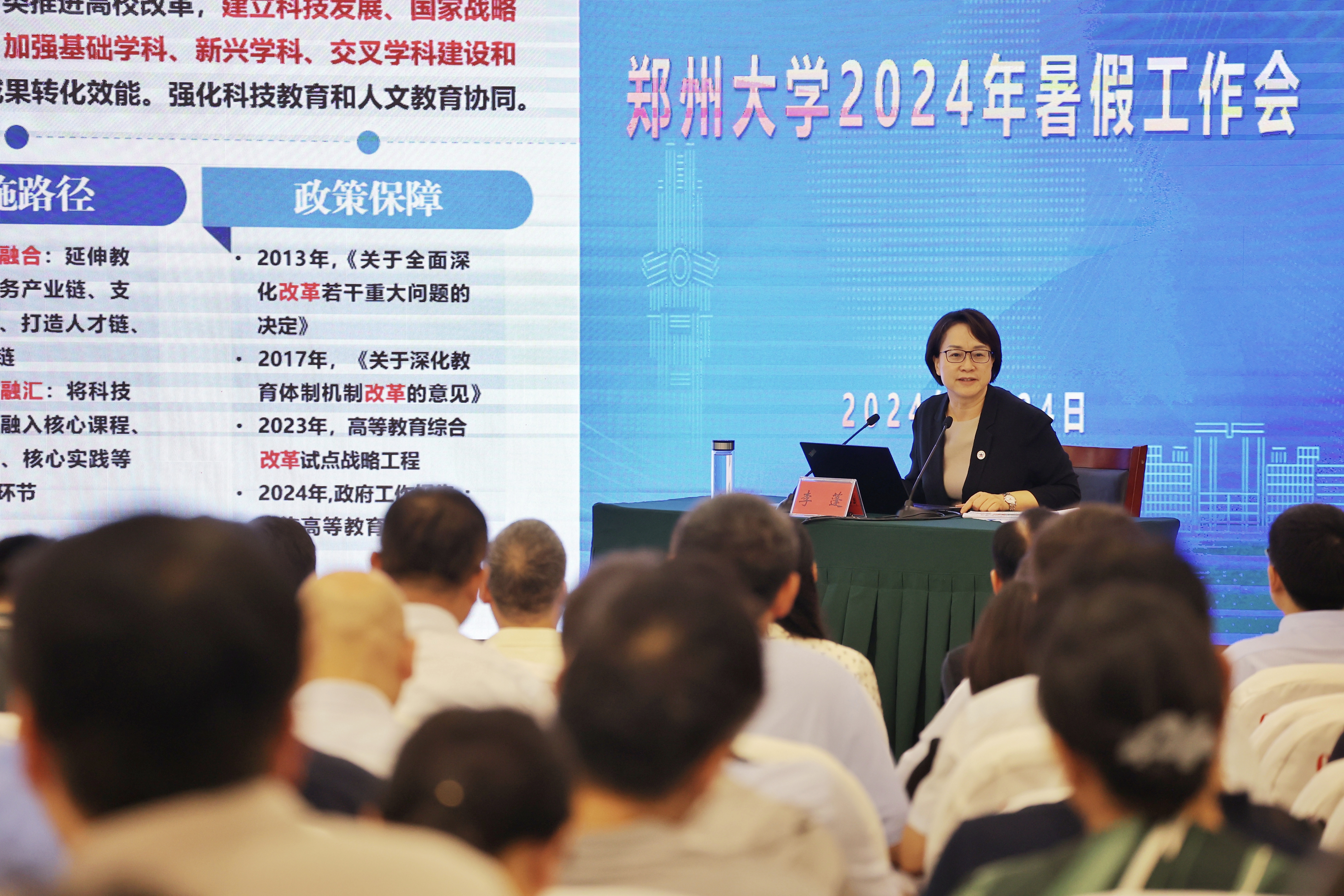 校长李蓬院士以《锚定八大行动 持续加压奋进 打赢“学科建设年”攻坚战》为主题作了讲话。她指出,今年是不平凡的一年,全国两会,全国科技大会、国家科学技术奖励大会、两院院士大会,党的二十届三中全会相继召开,部署了许多事关全局、面向长远的大事要事。我们要深刻领悟新时代高等教育的重大使命和责任,立足教育、科技、人才一体化,深入贯彻落实《中共中央关于进一步全面深化改革、推进中国式现代化的决定》,把握高等教育进一步深化改革的历史机遇,坚持目标导向、问题导向和效果导向,积极开展“两个先行先试”,切实落实“三个有组织”,下好下一步学校发展的先手棋,争取学校再上台阶的主动权。李蓬从党建高质量提升、学科建设提升、高水平师资队伍建设提升、科技创新能力提升、拔尖创新人才自主培养能力提升、开放办学提升、治理能力提升、保障能力提升8个方面,系统梳理盘点了上半年工作进展和主要成效,围绕年初设定的关键指标完成情况分析了学校发展状态和突出短板,并部署安排了暑假期间要重点落实的工作。她强调,要把思想和行动进一步聚焦到学校“八大提升行动”上来,利用好暑期时间,补短板、强弱项、固根本,为顺利完成“学科建设年”各项任务打好基础。