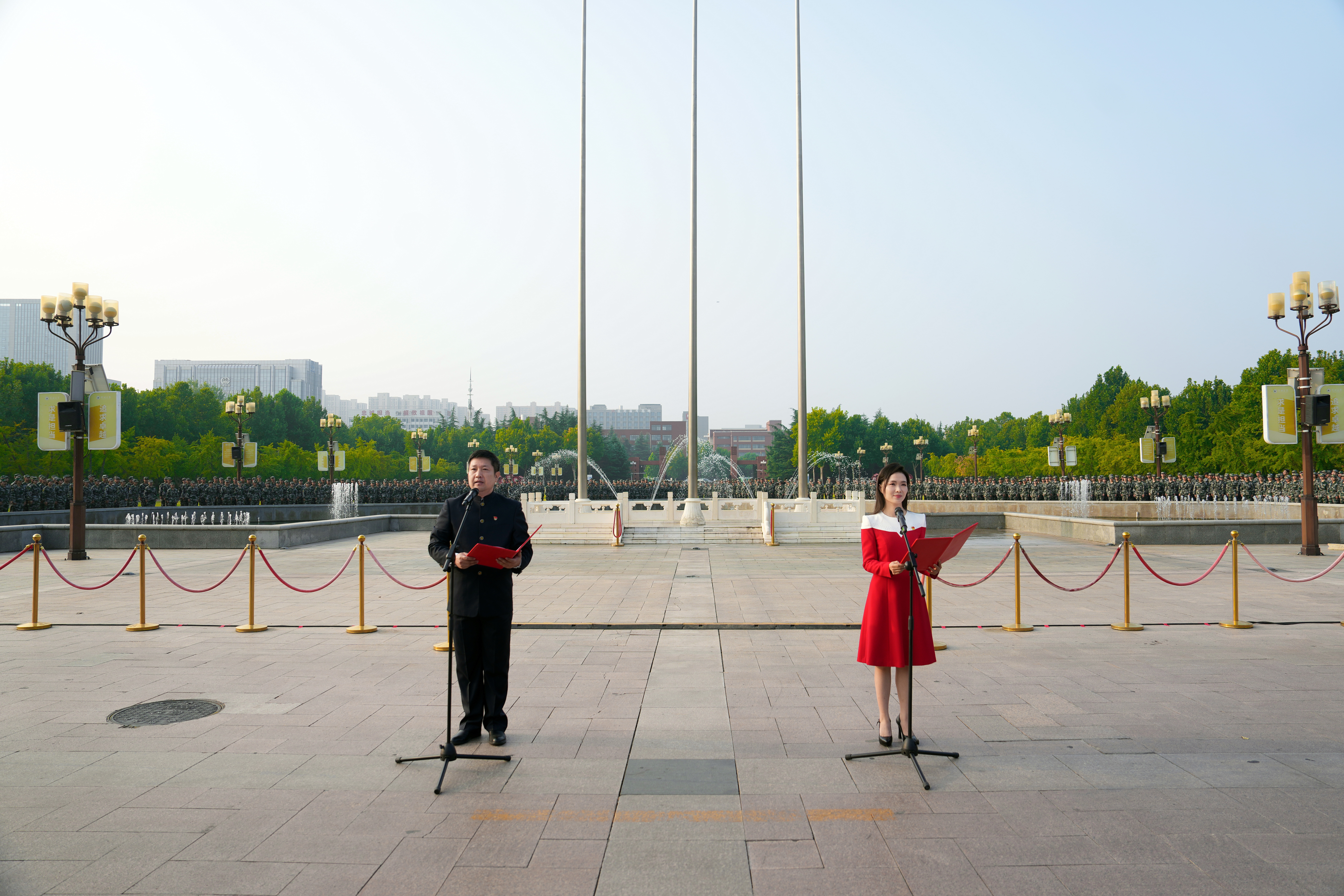 随后,新闻与传播学院教师陈卓、张楠饱含深情地朗诵《中国精神》,展现出奋斗中国的朝气蓬勃,激励广大师生弘扬劳动精神、工匠精神,为强国建设、民族复兴贡献力量。教师代表化学学院李恺、材料科学与工程学院张鹏、第一临床医学院陈淼,以“请国旗见证 我们共成长”为题庄严承诺“严谨求实、认真细致,率先垂范、以身作则”,铿锵有力的声音表达了践行教育家精神,促进学生全面发展,为学校“双一流”建设奋楫笃行的坚定决心。化学学院邵文博、材料科学与工程学院曹家源、第一临床医学院黄梓源代表全体新生,以“不负时代 强国有我”为题郑重宣誓,铮铮誓言,久久回荡,彰显了新时代郑大学子勇担使命、矢志报国的壮志豪情。在国旗的见证下,师生互换“我们共成长 我们互见证”承诺书。