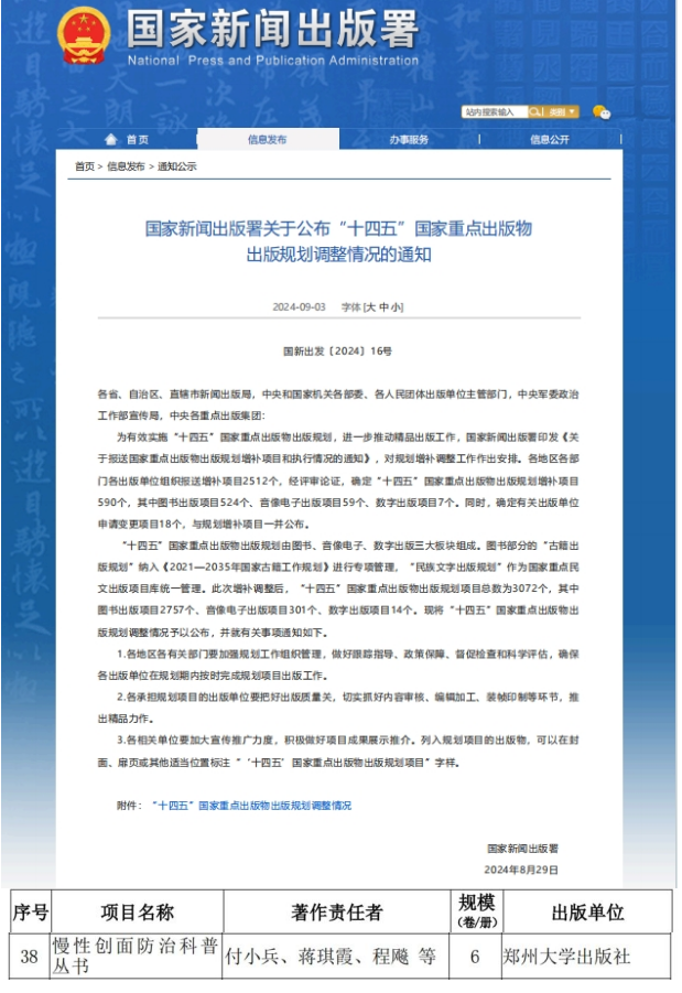 近日,《国家新闻出版署关于公布“十四五”国家重点出版物出版规划调整情况的通知》(国新出发〔2024〕16号)发布,best365英国在线体育官网出版社组织策划的“慢性创面防治科普丛书”入选“十四五”国家重点出版物出版规划增补项目。